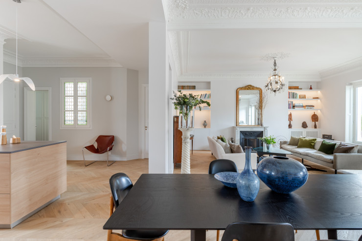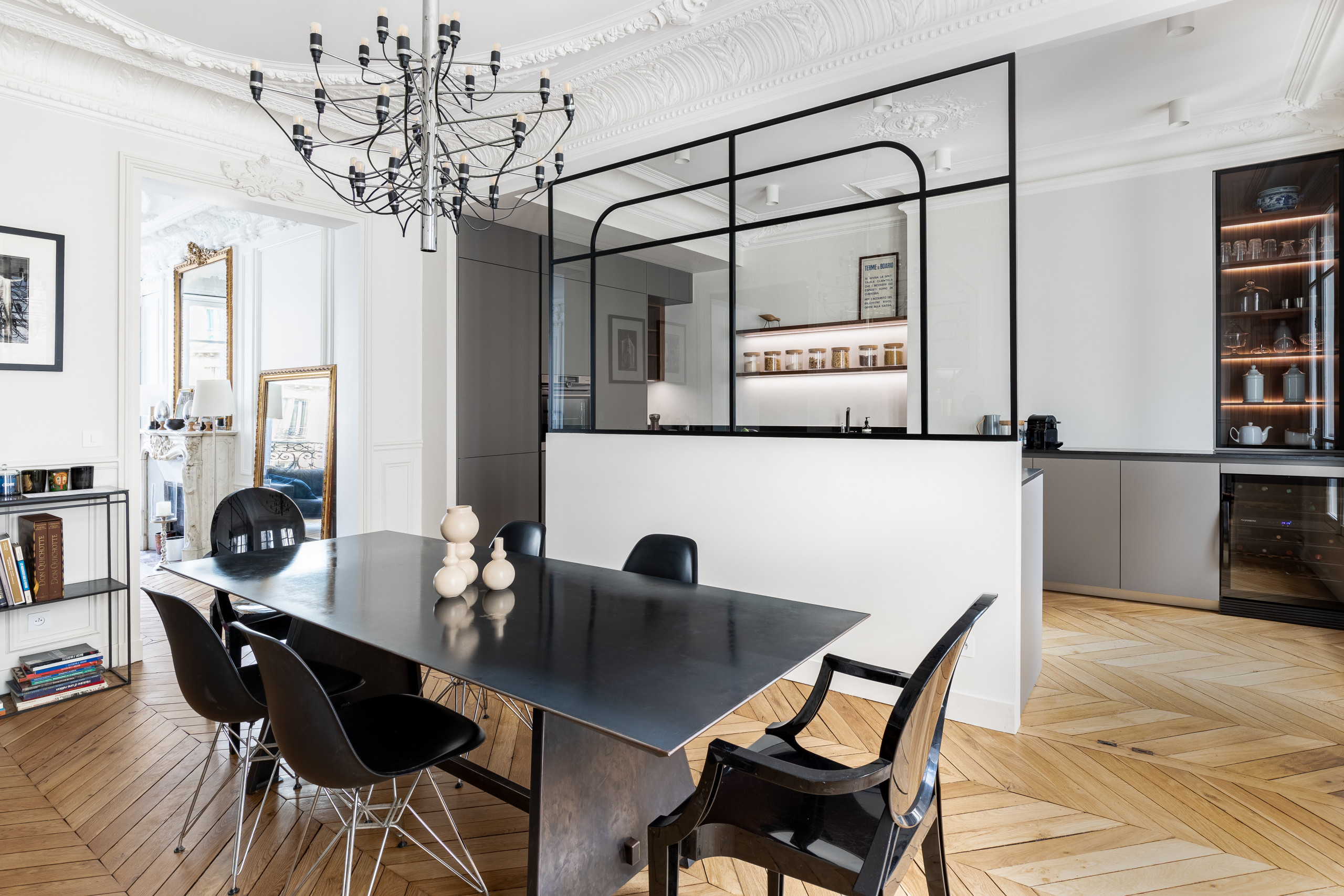 La touche de sophistication est apportée par des meubles hauts vitrés dont le verre fumé et l’éclairage intégré mettent en valeur une collection de verrerie qui se devine exceptionnelle. Le petit plus ? Une péninsule qui prolonge l’îlot central en un coin petit-déjeuner intimiste pour débuter la journée en douceur ! Ou comment faire rimer luxe discret et fonctionnalité maximale…