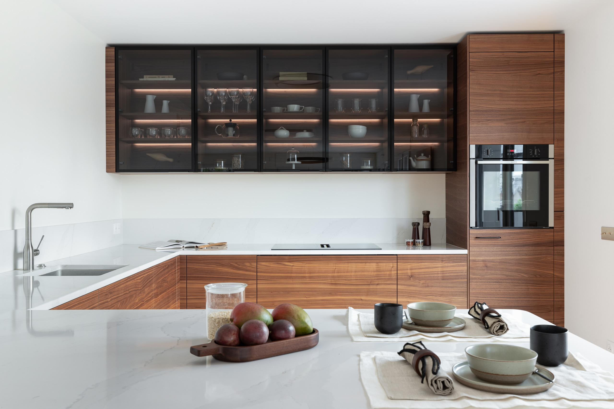 C’est au cœur du quartier prisé de Montmartre que eba s’est donnée pour mission de transformer une cuisine de 13 m² en un espace ouvert sur la salle à manger et le salon. Dans cette pièce baignée par la lumière naturelle et surplombant la Ville Lumière, le projet était de concevoir une cuisine haut de gamme aussi élégante que fonctionnelle. Le choix d’un bois de Noyer Américain s’est tout de suite imposé pour les façades des meubles bas et de la colonne. Matériau chaleureux par essence, le bois crée une atmosphère propice au partage et à la convivialité de sa seule présence. On craque également pour son veinage unique à la teinte ambrée que vient souligner l’absence de poignée.