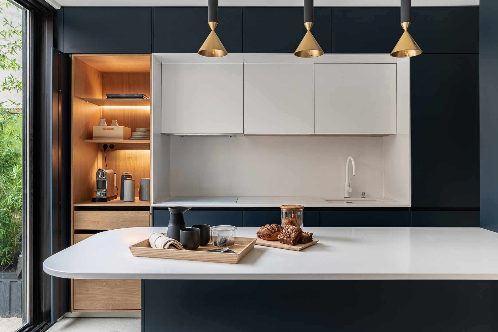De cette combinaison tout en contraste naît une dynamique visuelle aussi vibrante qu’accueillante qui fait écho à la luminosité naturelle provenant de la grande terrasse attenante. Mais l’esthétique ne serait rien si elle ne venait optimiser la fonctionnalité. À l’image des bords arrondis de ce comptoir qui créent un espace enveloppant tout en fluidifiant les zones de circulation de ce petit espace. Ou encore de ce meuble escamotable qui sert de rangement pratique autant que de pièce maîtresse à l’harmonie d’ensemble !