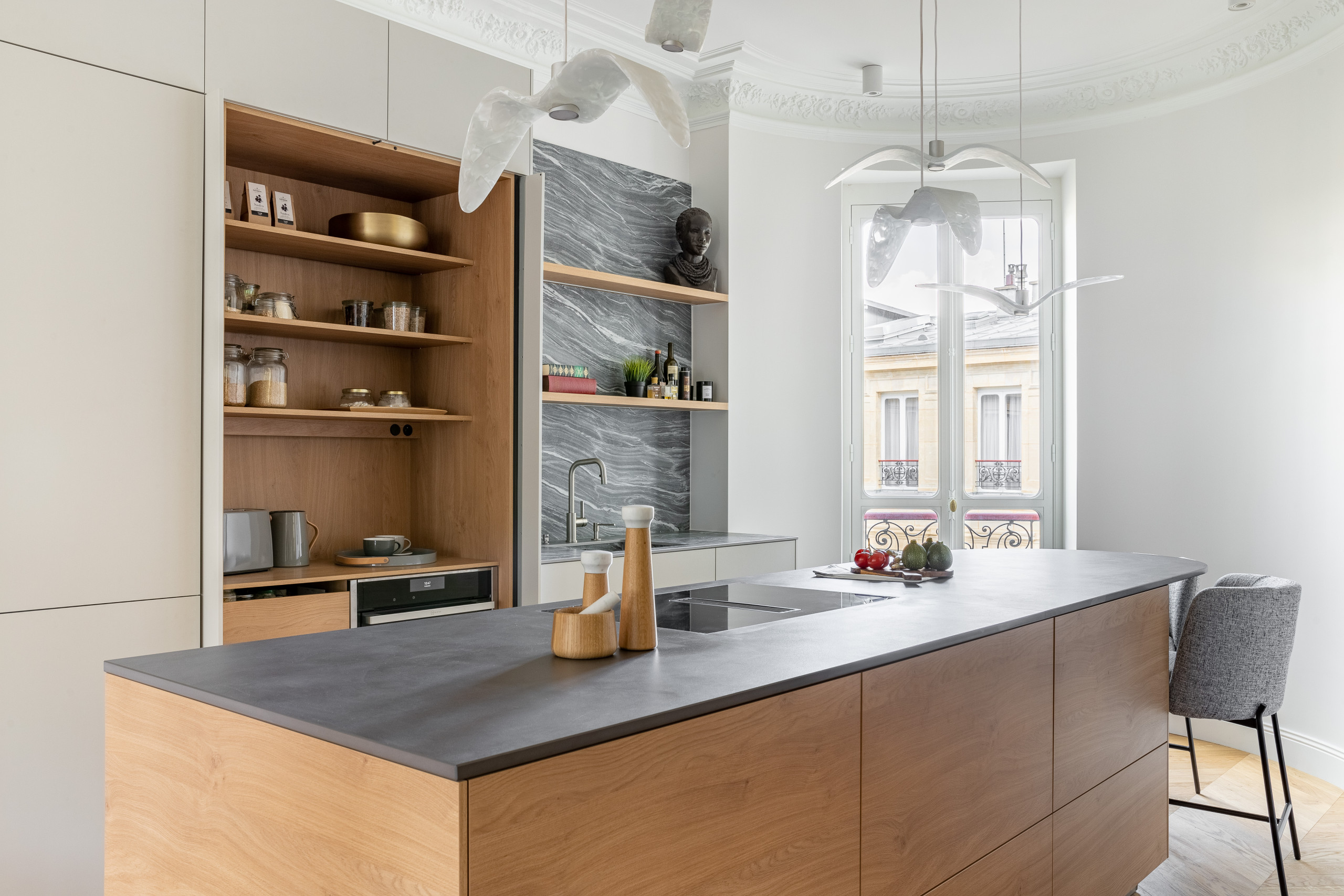 C’est dans un hôtel particulier à la vue incroyable sur les toits de Paris qu’un couple d’expatriés a imaginé cette grande cuisine ouverte et décloisonnée pour recevoir ses enfants et petits-enfants, résultat d’une collaboration fructueuse entre l’architecte Véronique Bertholon de Mis en Chantier et eba, spécialisés dans la conception de cuisines. Avec une ambition avouée : dessiner un espace agréable à regarder et facile à vivre au quotidien ! Véritable coup de cœur de la rédaction, cette composition captivante aimante le regard. En cause ? La combinaison élégante qui unit les façades Gris Brume Soie, l’îlot central en Chêne Naturel et le plan de travail en Neolith Mar del Plata.