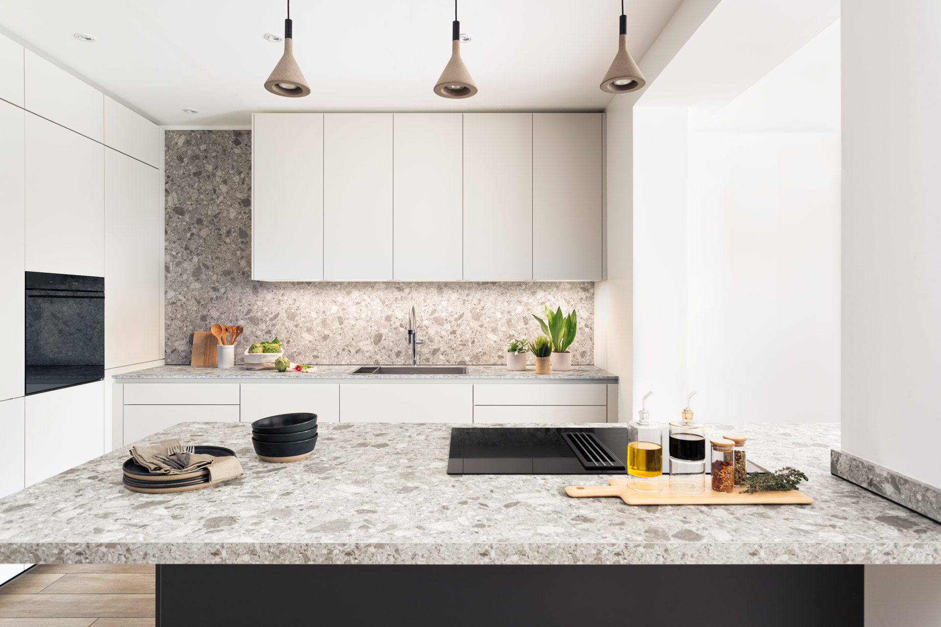 À la fraîcheur du gris clair répond la chaleur du bois et l’authenticité de la pierre, le tout étant rehaussé par les sublimes luminaires poétiques en forme d’oiseaux de Brokis également disponibles chez eba. Et le résultat de ce mélange de matières et de couleurs est sans égal. Derrière les lignes minimalistes de cette cuisine contemporaine se cache une surface de travail fonctionnelle. Au-delà de former un espace supplémentaire de préparation des repas, l’élément central est aussi une zone de rassemblement où la famille peut s’asseoir, discuter et partager un bon petit plat. De quoi se constituer un stock de souvenirs pour la vie !