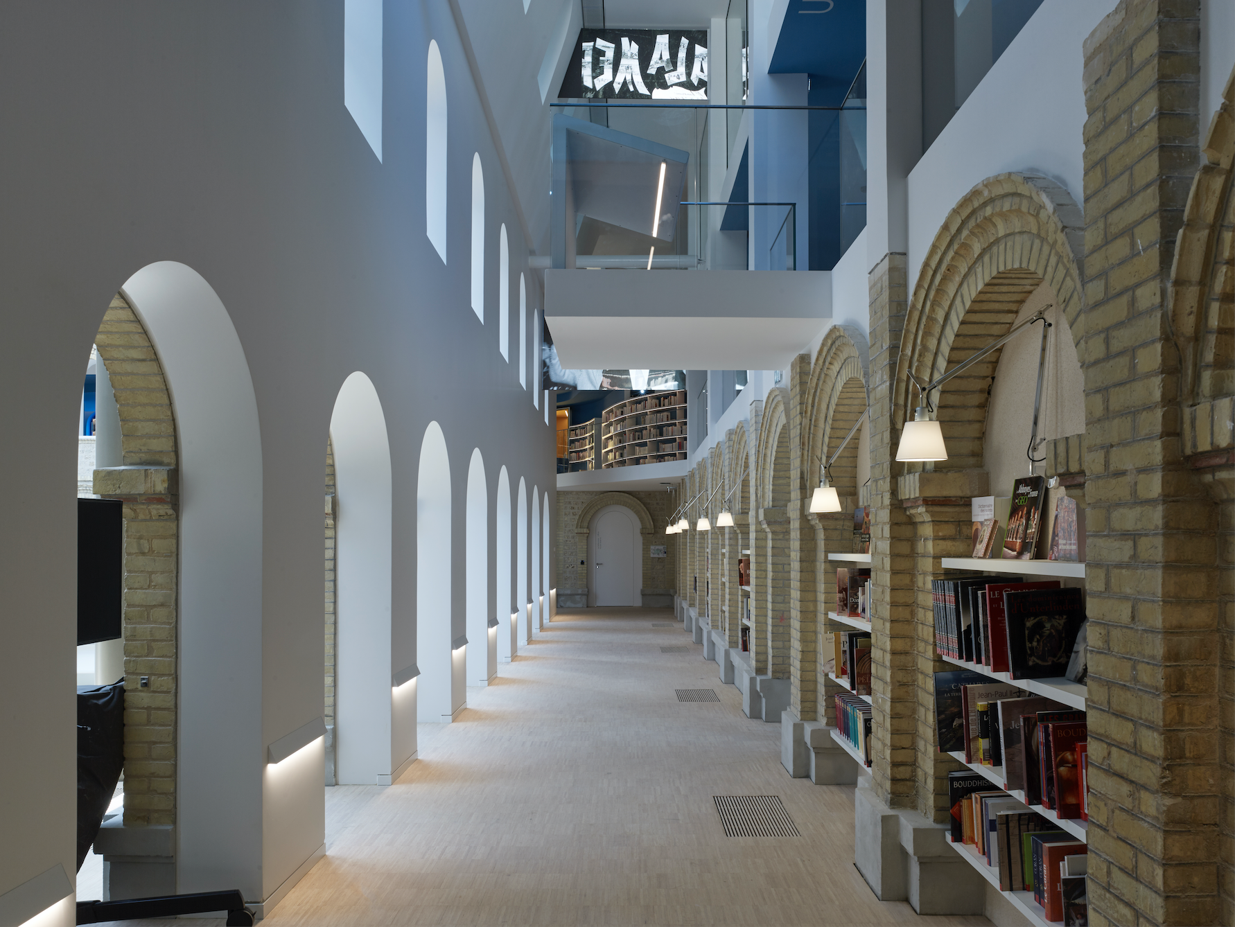 Si Alain Moatti a conservé une grande partie de l’enveloppe en brique, il a aussi sublimé certaines parties existantes, à l’image de la chapelle qui mue en auditorium et dont les ouvrants conservent les vitraux originaux. Ou bien le cloître dont le patio a été couvert et qui s’affiche comme la pièce majeure du dispositif. Cette salle de 400 m2 permet en effet d’accueillir en toute saison des visiteurs qui peuvent s’y installer pour lire, travailler, échanger, se détendre…