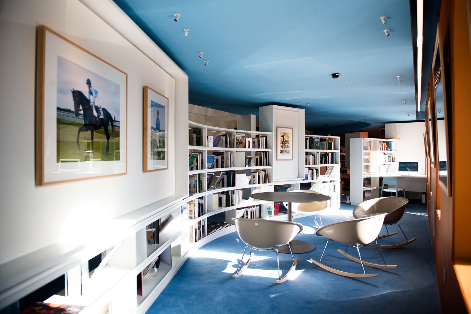Dans les deux niveaux de salles qui courent sur tout le pourtour, l’architecte a déroulé un immense « ruban » le long duquel s’agrègent livres, photographies, films et documents sonores autour des thèmes chers à la ville: l’activité équestre, le cinéma, la plage…