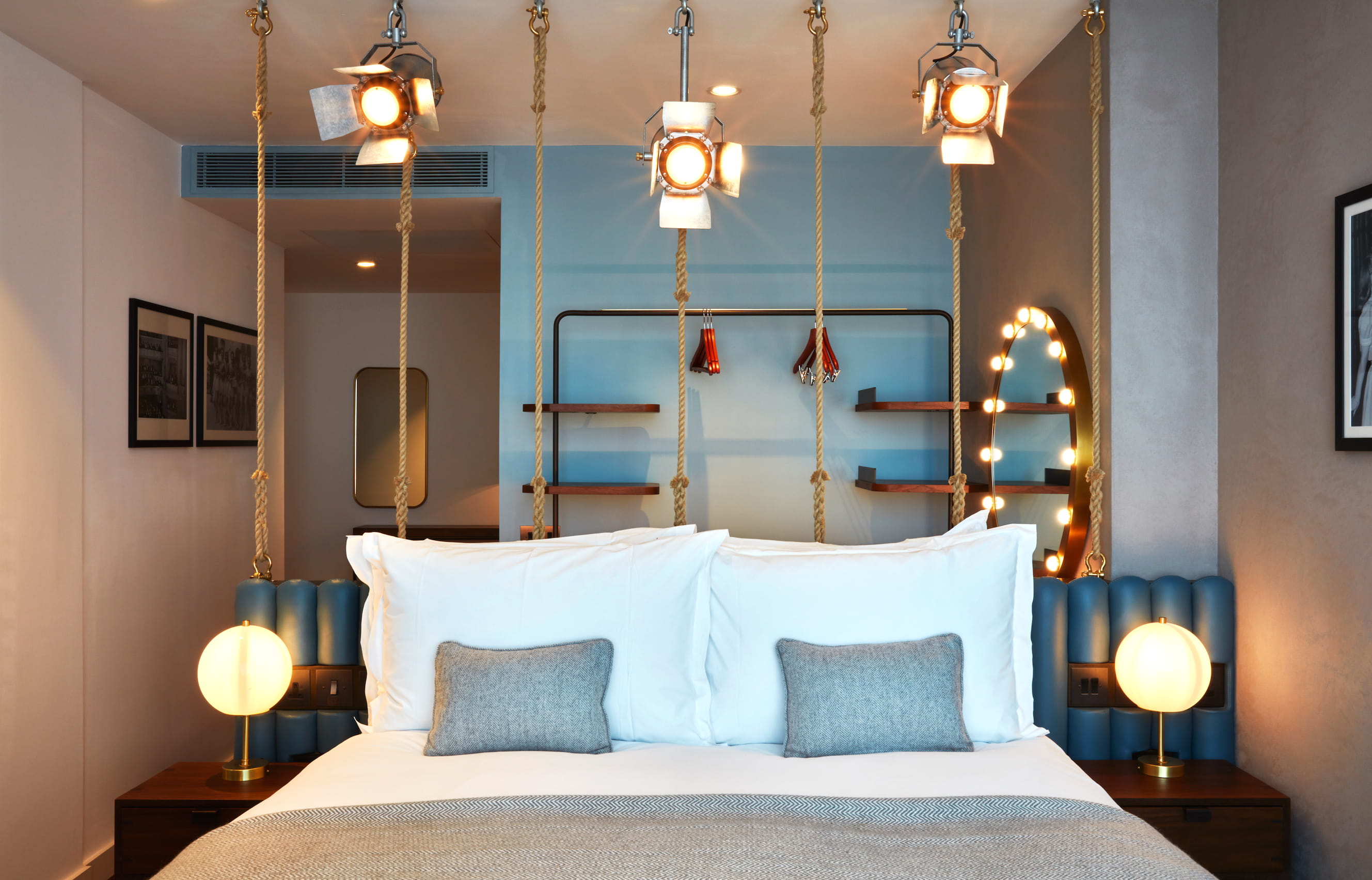 A l’approche du London Design festival, Alex Michaelis et Tim Boyd viennent de dévoiler un tout nouveau projet dans la capitale britannique avec l’Hôtel Indigo, situé au 1 Leicester Square, pile entre Covent Garden et Piccadilly Circus. Dans ce quartier de théâtres, music-halls et cinémas, l’agence Michaelis Boyd s’est imprégné des alentours de l’hôtel pour penser un décor tout en cohérence. C’est ainsi que les 95 chambres rendent hommage à l’univers de l’entertainment et sont réparties en trois catégories : « scriptwriter », « backstage » et « auditorium ». Affiches vintage du septième art, miroirs de loges d’artistes, projecteurs et cordes évoquant les changements de décor sur les planches… Tout y est ! Dans l’entrée, une fresque de style Art Déco plonge d’emblée le visiteur dans le glamour du siècle dernier. Neuf étages plus haut, il peut découvrir la vue affolante du rooftop qui accueille les gourmands pour un petit déjeuner, un lunch ou un dîner.