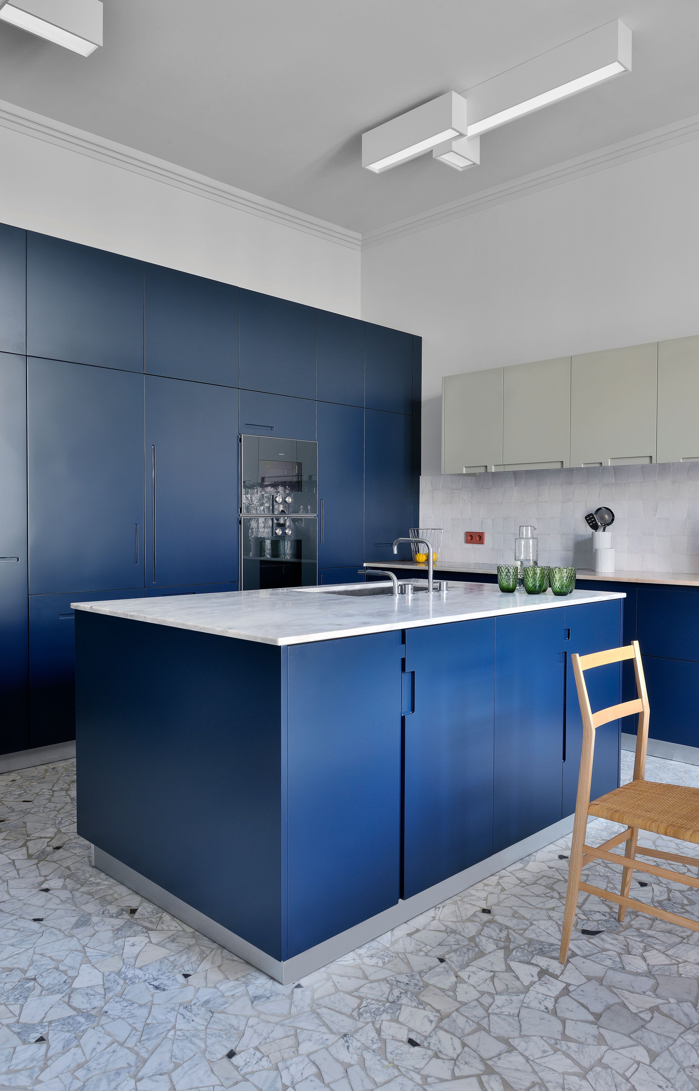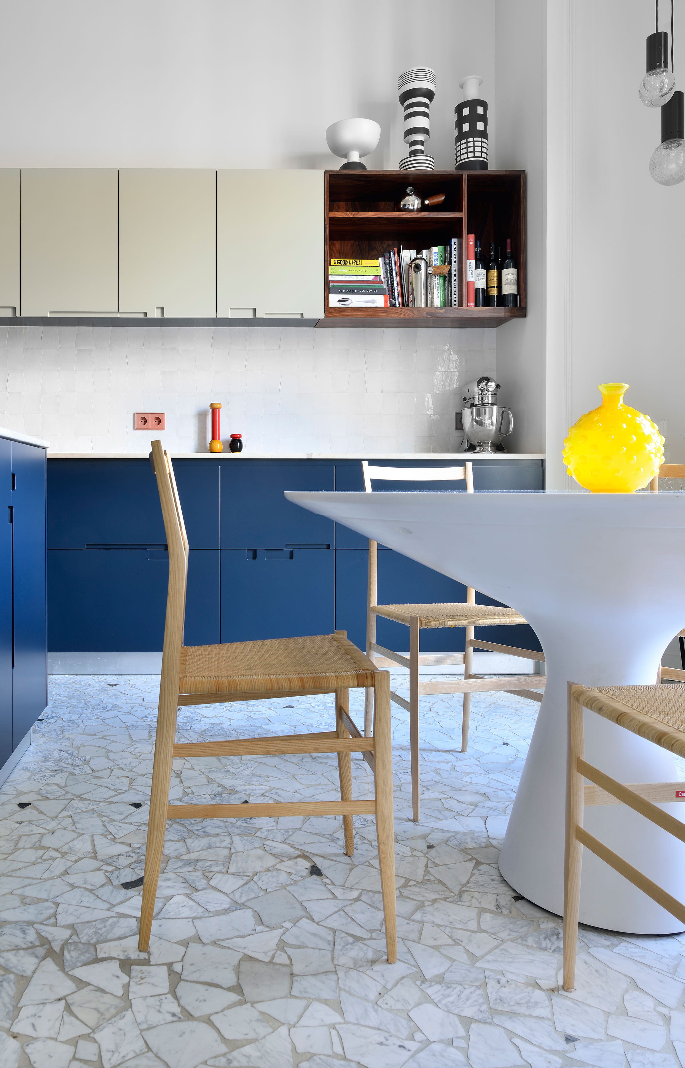 Elle a tracé jusqu’à la forme des poignées de portes intégrées dans les meubles, détail graphique que l’on retrouve sur les placards des chambres et du dressing, comme un gimmick réservé aux initiés. « Je ne voulais pas vivre dans un lieu pompeux, j’ai donc appliqué de la couleur pour décontracter ce vaste appartement. Je suis allée piocher dans la gamme de peintures Le Corbusier issue de ses recherches chromatiques », détaille celle dont la spécialité est le grand écart entre passé et présent, entre histoire et monde contemporain, lesquels dialoguent effectivement en toute décontraction dans sa demeure.