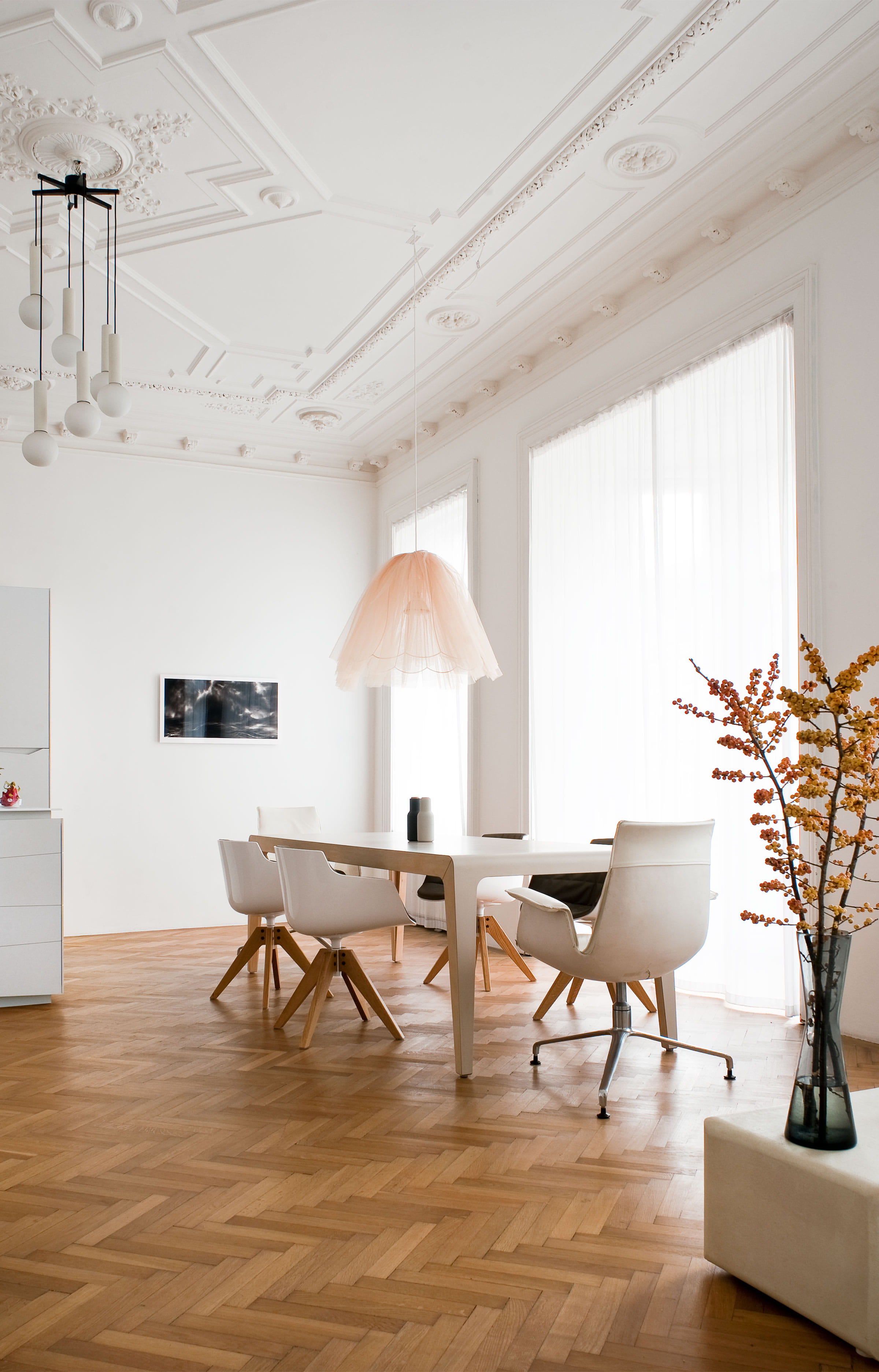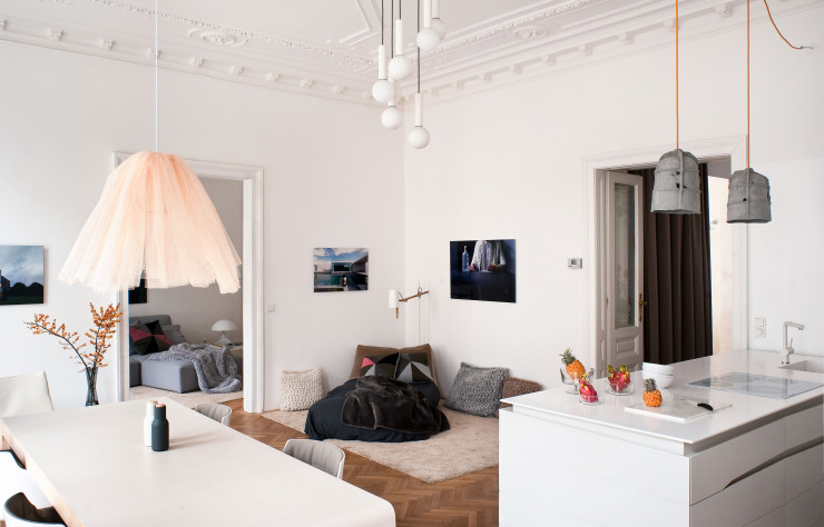 Nulle mièvrerie, donc, ni harmonie calculée, même si le parquet à chevrons et la belle hauteur sous un plafond décoré de frises délicates renouent avec le très chic néoclassicisme viennois. Et cette blancheur omniprésente, presque envahissante, semble éviter toute faute de goût. Seules touches de couleurs sur les murs de cet univers aveuglant, les photos de Monika Nguyen, qui a rapporté de ses nombreux voyages des images de paysages, de villes, de flore et de faune, sur lesquels se pose son regard complice.