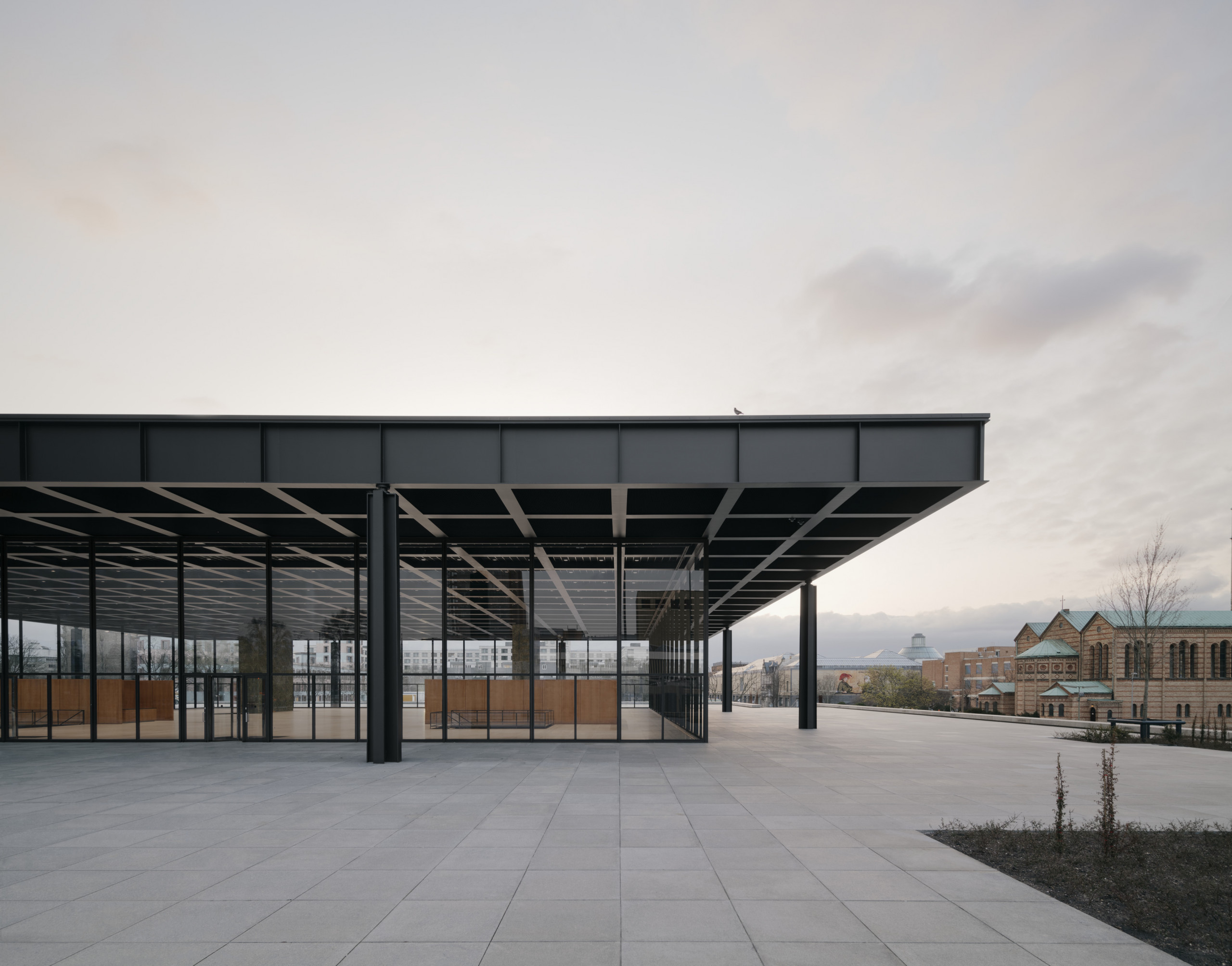 Si la Neue Nationalgalerie est érigée au rang d’icône, telle une conclusion tardive de la modernité, ce n’est pas par son écriture grandiloquente, mais au contraire par la simplicité d’une architecture qui, depuis plus de cinquante ans, traverse les décennies et a même changé de siècle sans jamais prendre une ride. Sur un plan inscrit dans un carré de 65 mètres de côté, les salles d’exposition sont logées dans le soubassement de l’édifice tandis qu’en surface, une série de huit poteaux cruciformes supporte la toiture en porte-à-faux qui coiffe les façades entièrement vitrées.