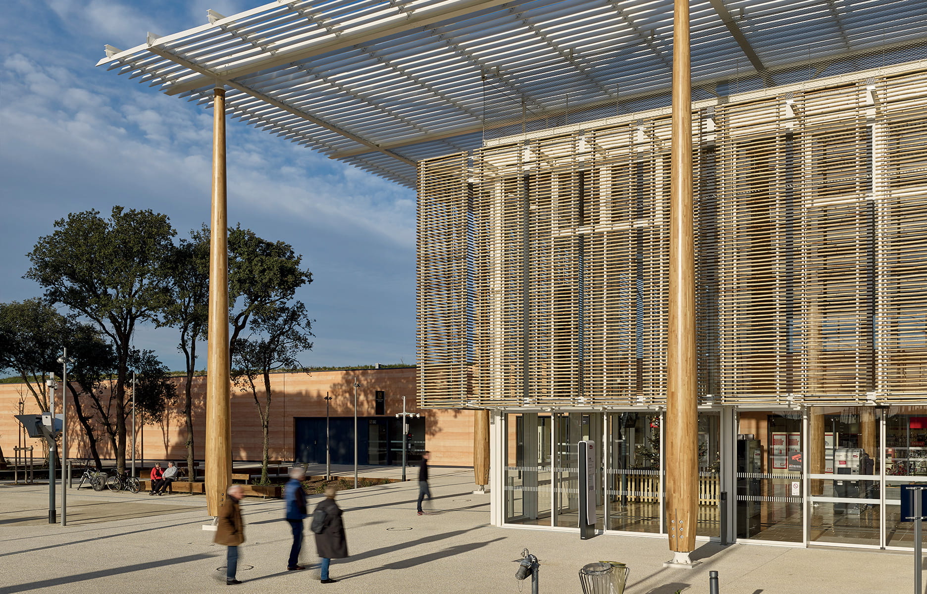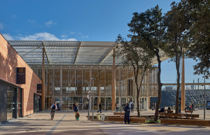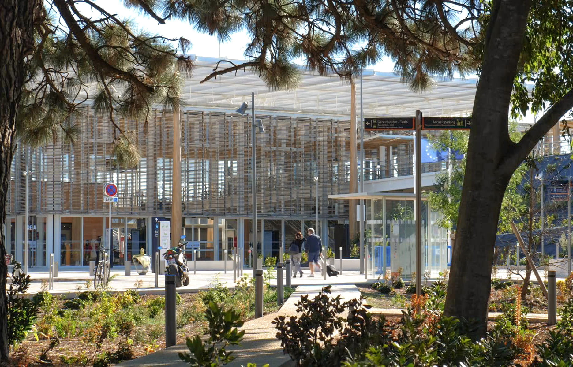 Face à l’environnement privilégié du site, l’éco-conception s’est vite imposée pour AREP. Forte d’un millier de collaborateurs, la plus grande agence d’architecture de France a redoublé d’efforts pour intégrer harmonieusement la nouvelle infrastructure dans un paysage de bosquets, de champs et de vignes. Aux abords du site, la grande majorité des pins, cèdres et chênes verts, parfois centenaires, a été conservé. De même qu’un ancien mas agricole qui accueillera bientôt une boutique de produits locaux et un espace de coworking. En complément, plus de 400 arbres ont été plantés pour aboutir à « un havre de paix climatique et sensoriel » qui favorise le maintien de la faune locale tout en accueillant les voyageurs dans une atmosphère de sous-bois, sereine et apaisante.