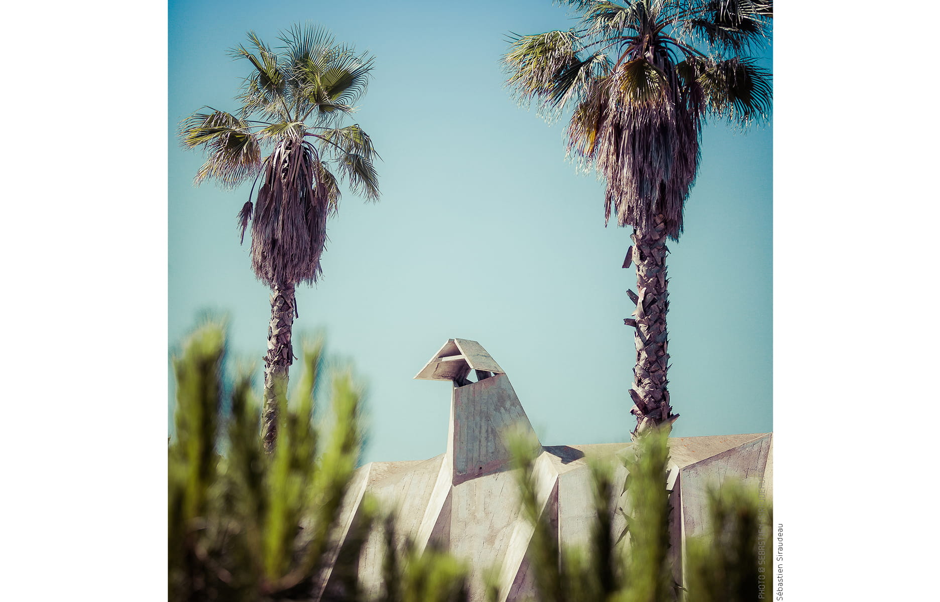 À deux pas de la Fondation Cartier, l’exposition évoque l’urbanisme de l’architecte et philosophe dès l’accrochage, avec une disposition en séries, entrecoupée de quelques grands formats. Des tirages à la mesure des immeubles aux inspirations aztèques, dont toute la richesse formelle se décline dans des cadrages carrés. Les mêmes que dans Bord de mer, un ouvrage réalisé par Sébastien Siraudeau en 2005, date à laquelle l’écrivain et journaliste décide de professionnaliser sa pratique de la photo pour compiler et immortaliser 757 bonnes adresses disséminées tout le long du littoral français.