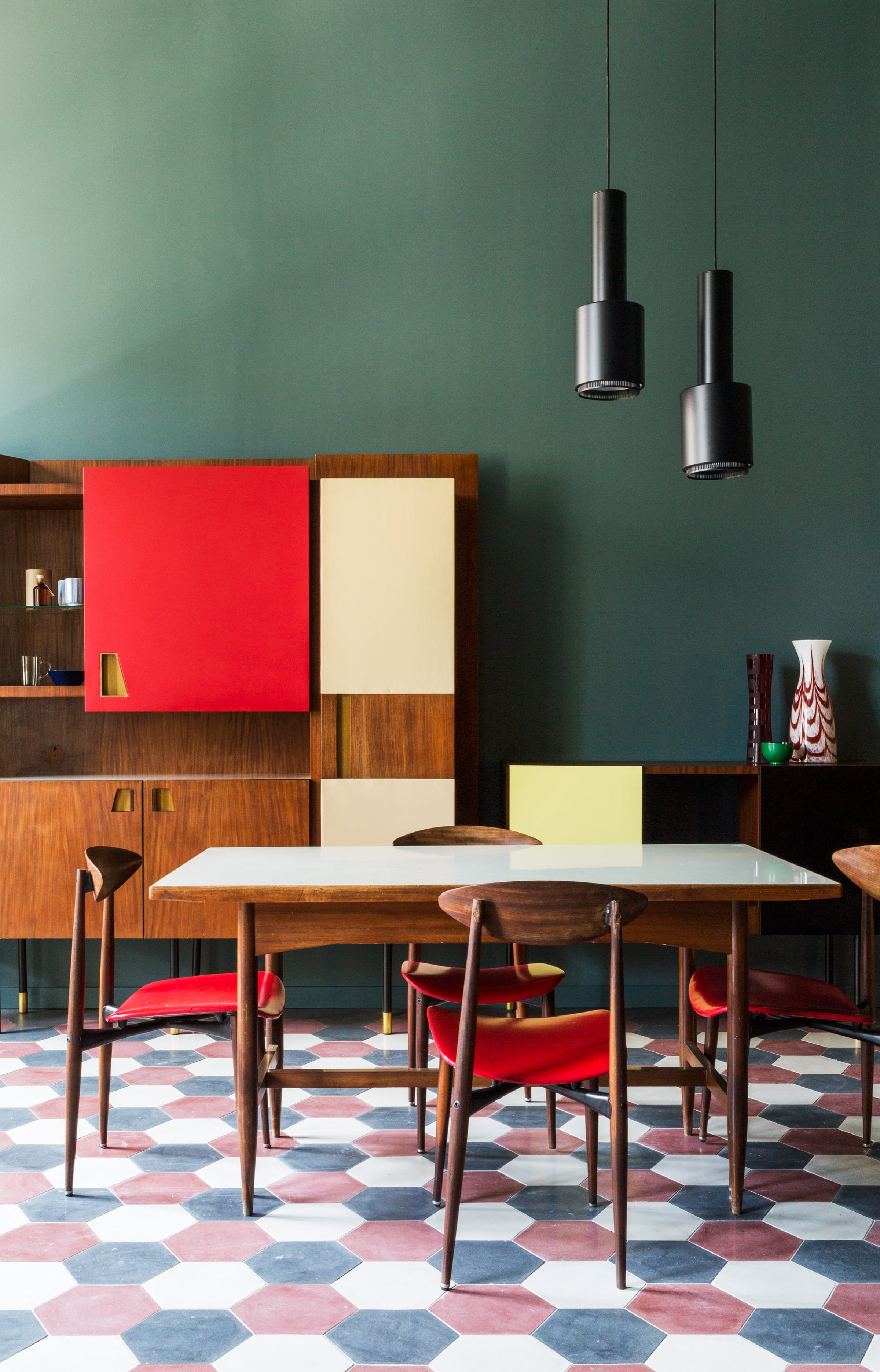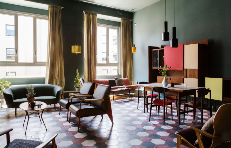 L’intérieur de cet hôtel branché a été réalisé par l’agence de marketing en stratégie culturelle H+, sous la direction de Stella Orsini. Il offre un merveilleux mélange de pièces de mobilier vintage des années 50, notamment une sélection de créations Vitra, obtenues grâce à un partenariat avec la marque historique, et de meubles spécialement conçus sur place, pour le projet, par des designers italiens tels que Leftover et Mezzo Atelier. Toutes de tailles différentes, les dix chambres sont desservies par un seul couloir décoré de carreaux de ciment hexagonaux verts, rouges et gris issus d’une fabrique sicilienne. Les chambres, elles, arborent un parquet en point de Hongrie, caractéristique des salons milanais d’époque. Le mobilier, choisi avec soin, offre un équilibre harmonieux entre l’ancien et le moderne, particulièrement mis en valeur par les tonalités douces des peintures Farrow & Ball.