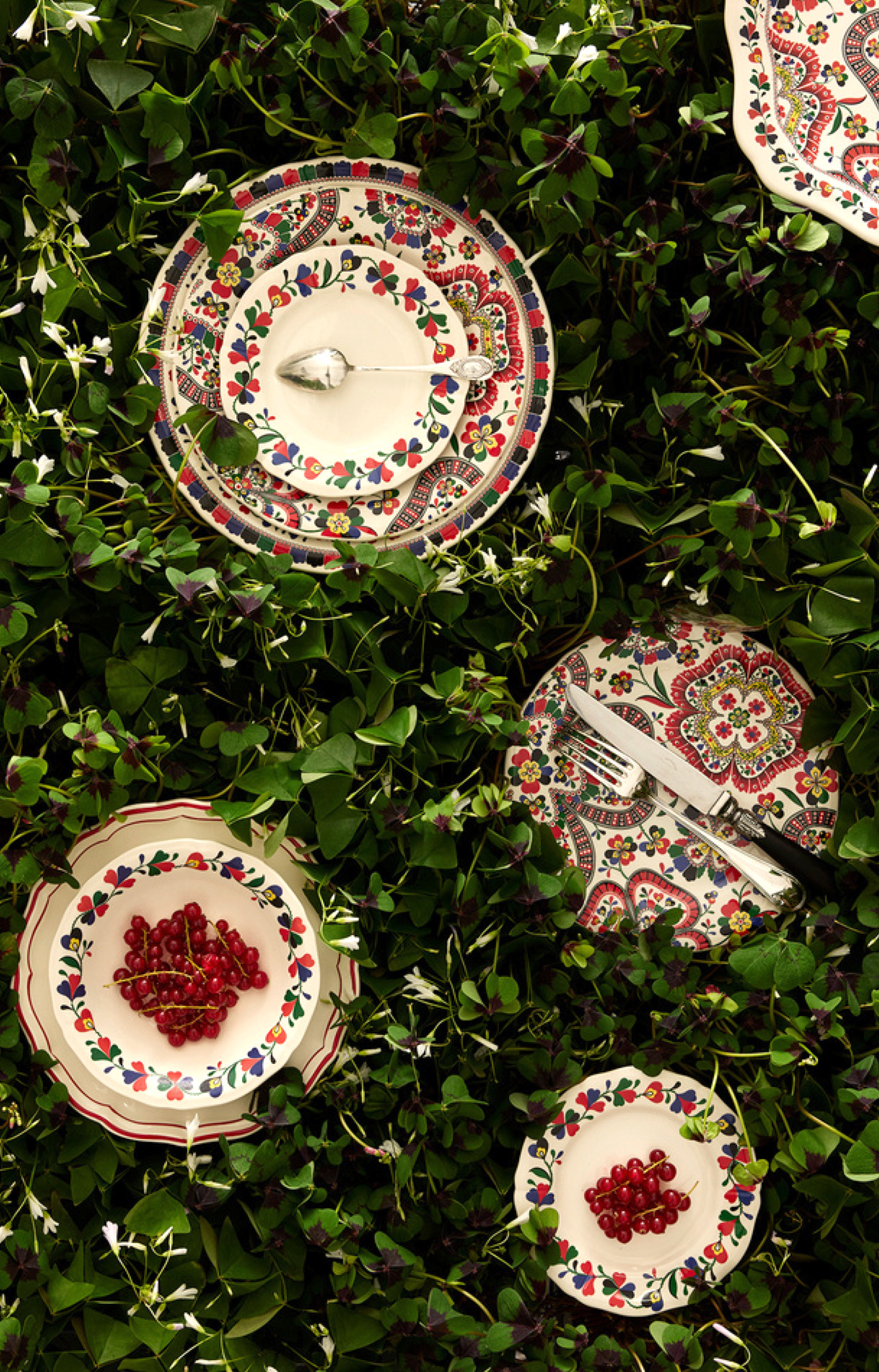 La collection Chance Folle imaginée par Nathalie Farman-Farma pour Gien réinvente le motif du trèfle à quatre feuilles à travers une approche inspirée des foulards folkloriques d’Europe de l’Est.