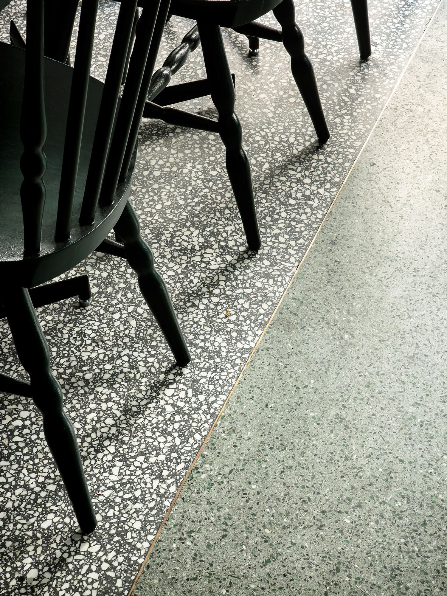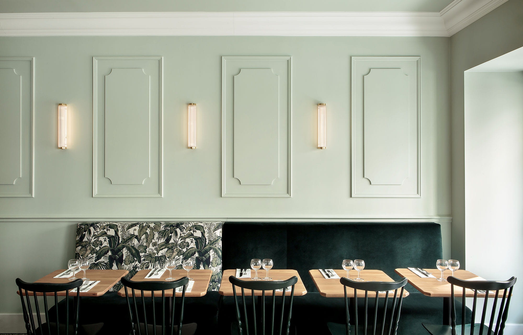 Le vert omniprésent du sol au plafond ne vient pas conter l’histoire d’un nouveau restaurant bio-bo. Non, il résonne tel un hommage à Paris, à ses toits au cuivre oxydé, aux chaises Luxembourg qui trônent dans ses jardins publics… Du vert d’eau à celui de la forêt, chaque teinte est savamment mise en scène : la plus claire sur les murs et au plafond, pour laisser respirer l’espace ; la plus foncée sur les éléments forts de la décoration (les chaises et le bar). Des détails de caractère, eux, sont parsemés ça-et-là, pour ne pas affoler l’œil. Le sol est ainsi habillé d’un sublime marbre blanc de Thassos mélangé à un marbre vert des Pyrénées alors que le mur du fond – celui qui invite les clients encore indécis sur le trottoir à franchir la porte – se pare d’une mosaïque moderne de carreaux de ciment.
