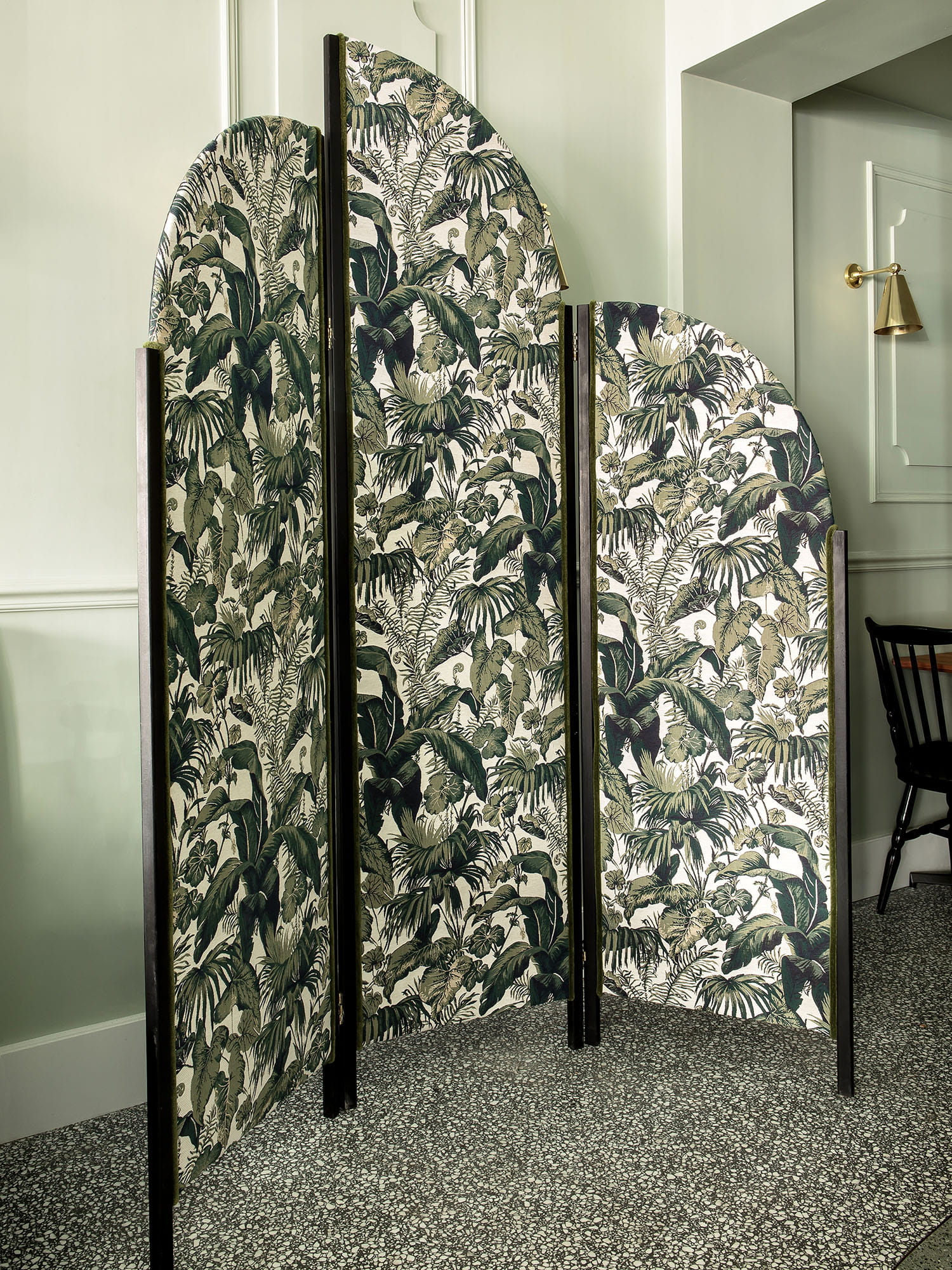 La douceur est partout, tout en courbes et rondeurs. Les assises de velours Kvadrat confirment cette impression, alors que le paravent à imprimé végétal créé sur mesure par la designer apporte une touche décalée à l’ensemble. Dans cette jungle urbaine, rien n’est laissé au hasard, pas même les discrètes appliques coniques en laiton qui modernisent les murs des côtés ou les modèles sphériques, qui soulignent la forme du bar tout en faisant de l’œil à la mosaïque.