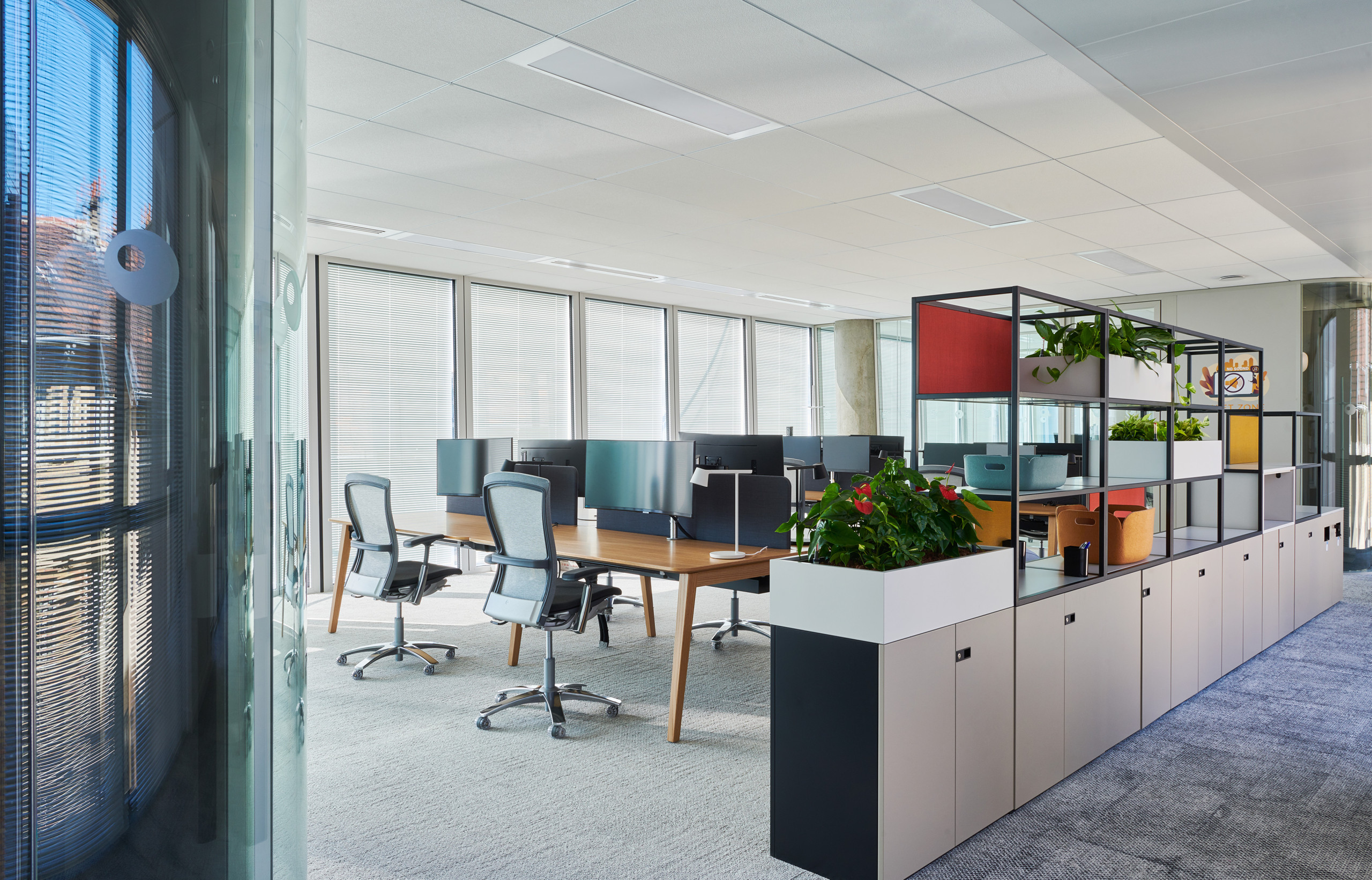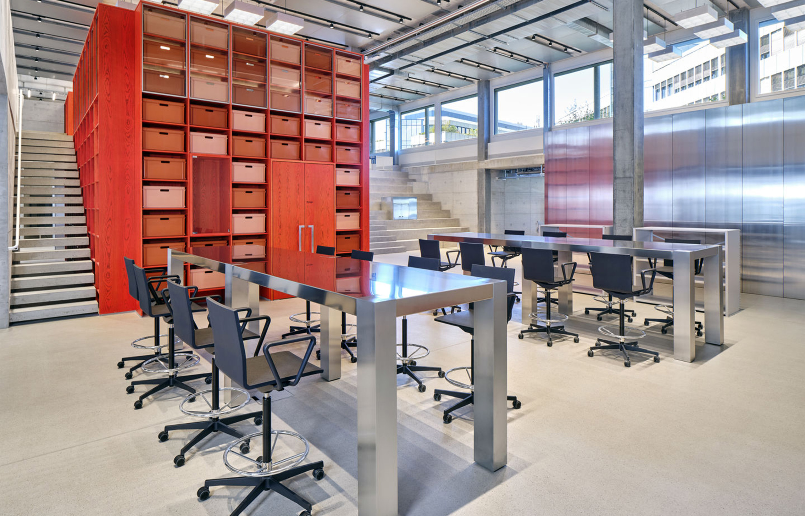 Pour accompagner sa croissance, la marque de chaussures de sport suisse On s’est installée en 2022 dans un immeuble de 17 étages réalisé par Spillmann Echsle Architekten et Specific Generic pour l’architecture intérieure. Pour ce projet, Vitra a été missionnée pour la planification et la conception de l’ameublement. Le bâtiment est divisé en villages de trois niveaux pour 100 à 150 employés afin de favoriser la cohésion des équipes, avec postes de travail non assignés, cuisine et espace détente. L’environnement est multifonctionnel et adaptable : la moitié du volume de chaque plateau comporte du mobilier et des cloisons faciles à déplacer.