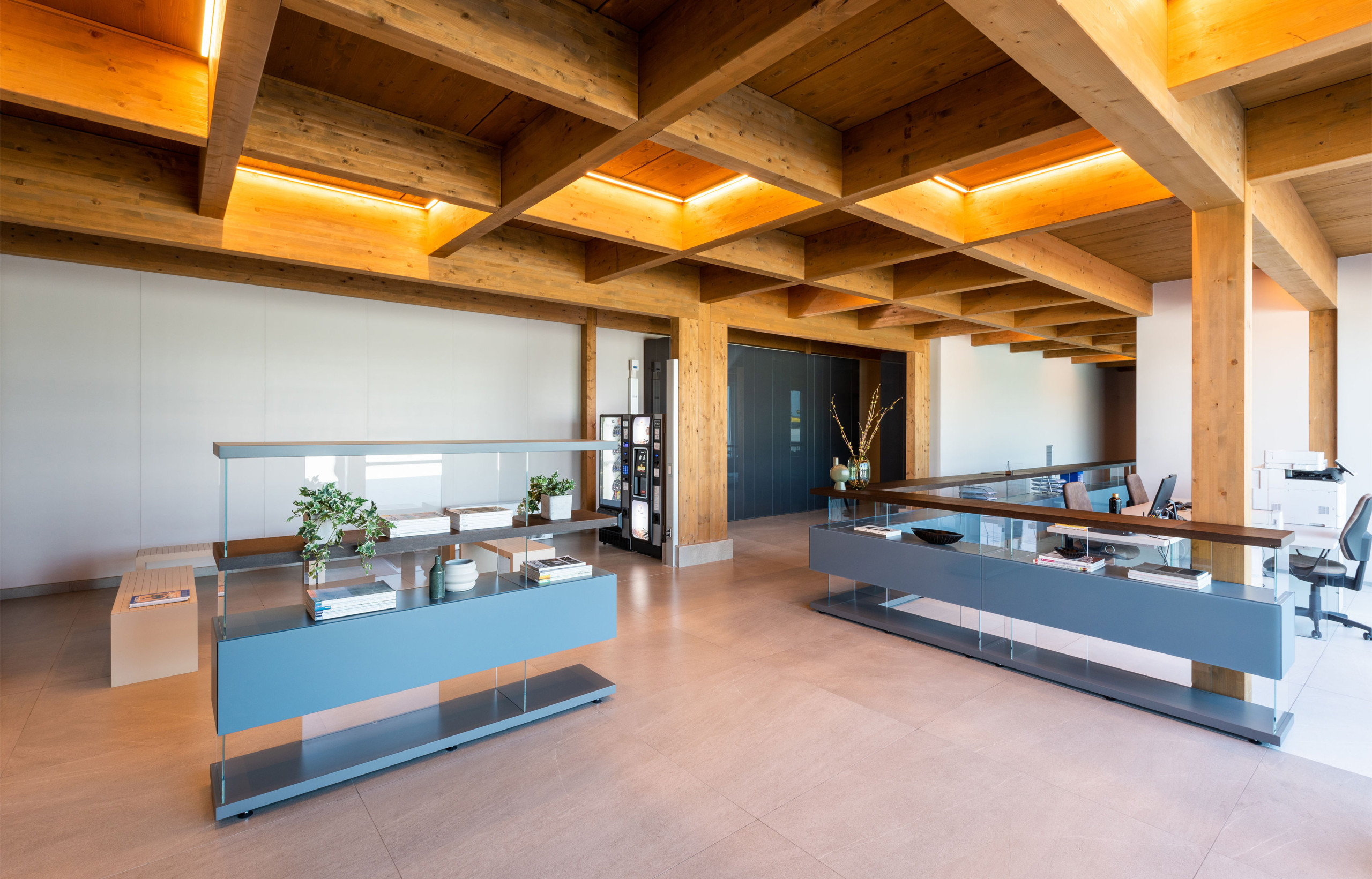 Contract Lab, fruit d’un partenariat entre Lago et MAD051, réalise des projets d’aménagements variés (hôtels, sièges d’entreprises, boutiques…). Pour Colla SpA, société de production de parmesan et de grana padano, l’architecte Carlo Ponzini a agencé les bureaux avec pour demande la mise en avant de l’héritage culturel et une ouverture sur l’avenir. Le résultat : sous les caissons en bois massif du plafond, le mobilier Lago, avec effet pierre, teintes neutres et piétements en verre XGlass, apporte contraste et sentiment de légèreté. Les armoires NOW, à double face, réalisées sur mesure, créent une partition des espaces.