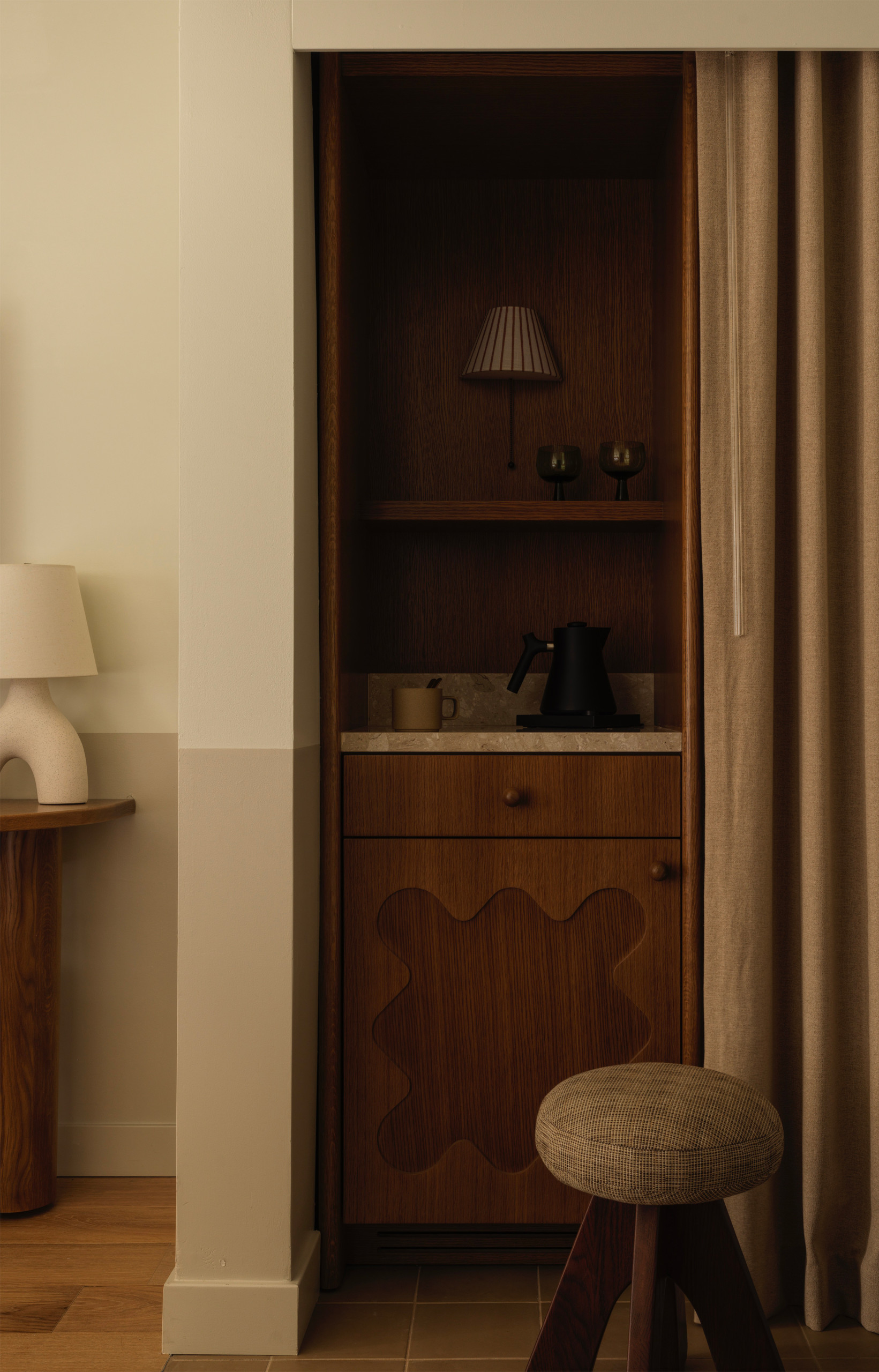 Les tabourets du lobby, réalisés sur mesure, présentent des motifs sculptés inspirés aussi bien par les menuisiers du coin que les méditerranéens. Les hôtes retrouvent ces mêmes évocations sur certaines chaises des chambres, faites de bois chaud, à l’unisson avec le mobilier de l’hôtel.