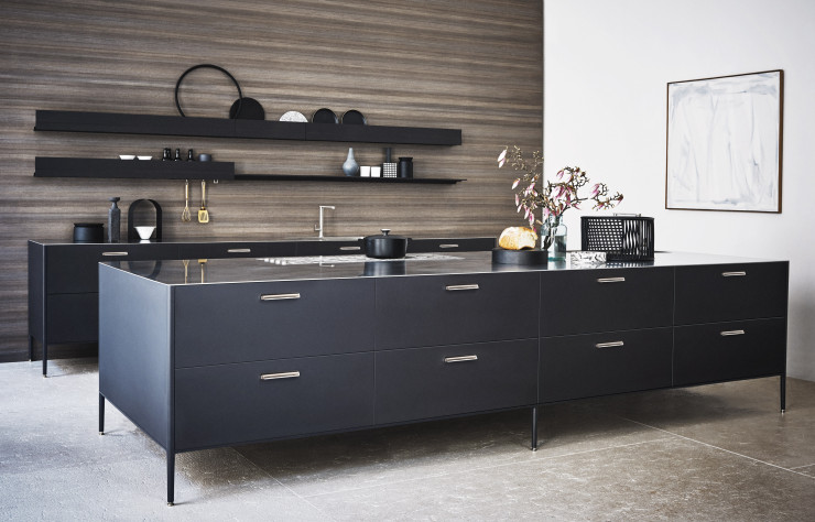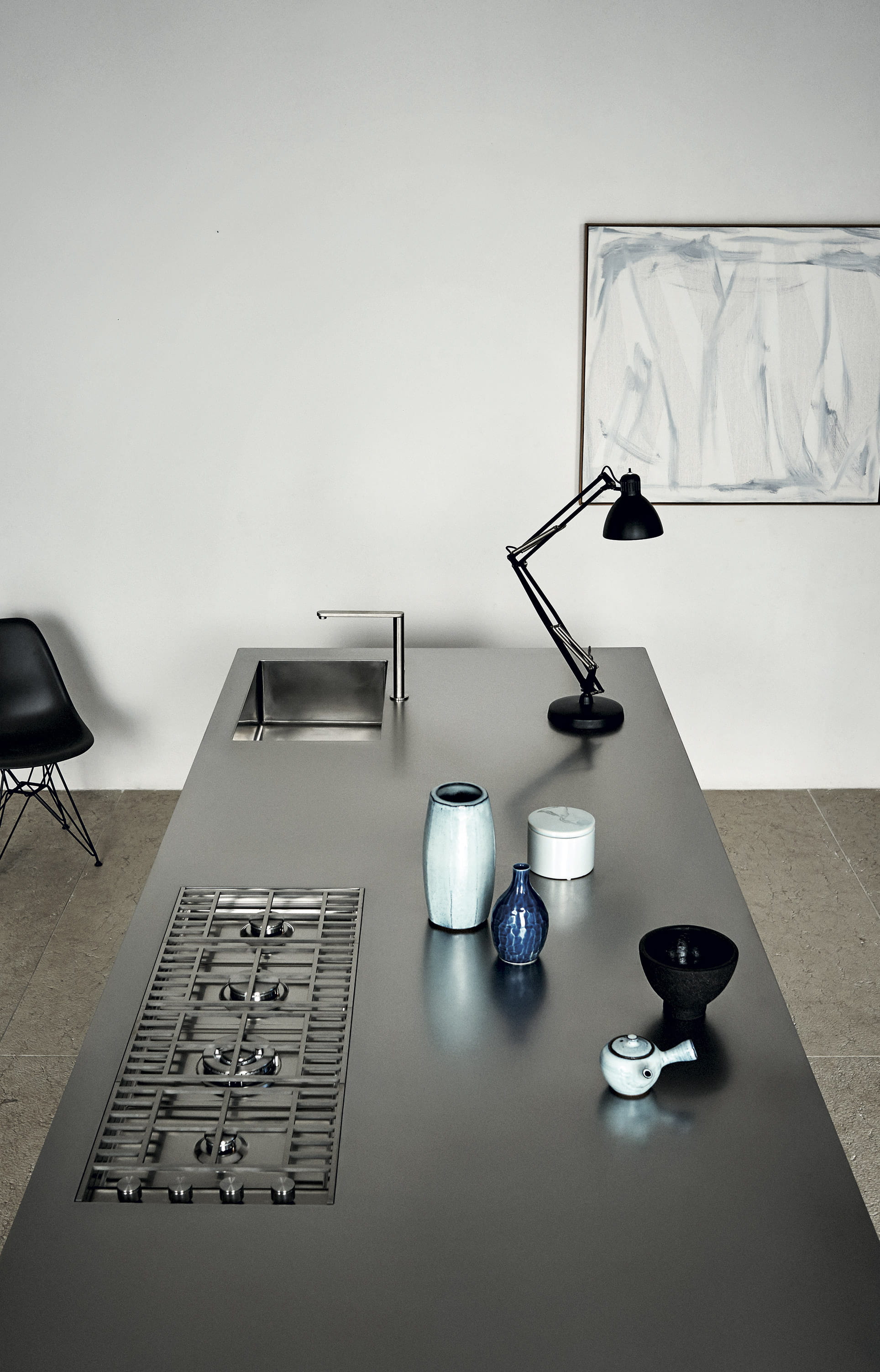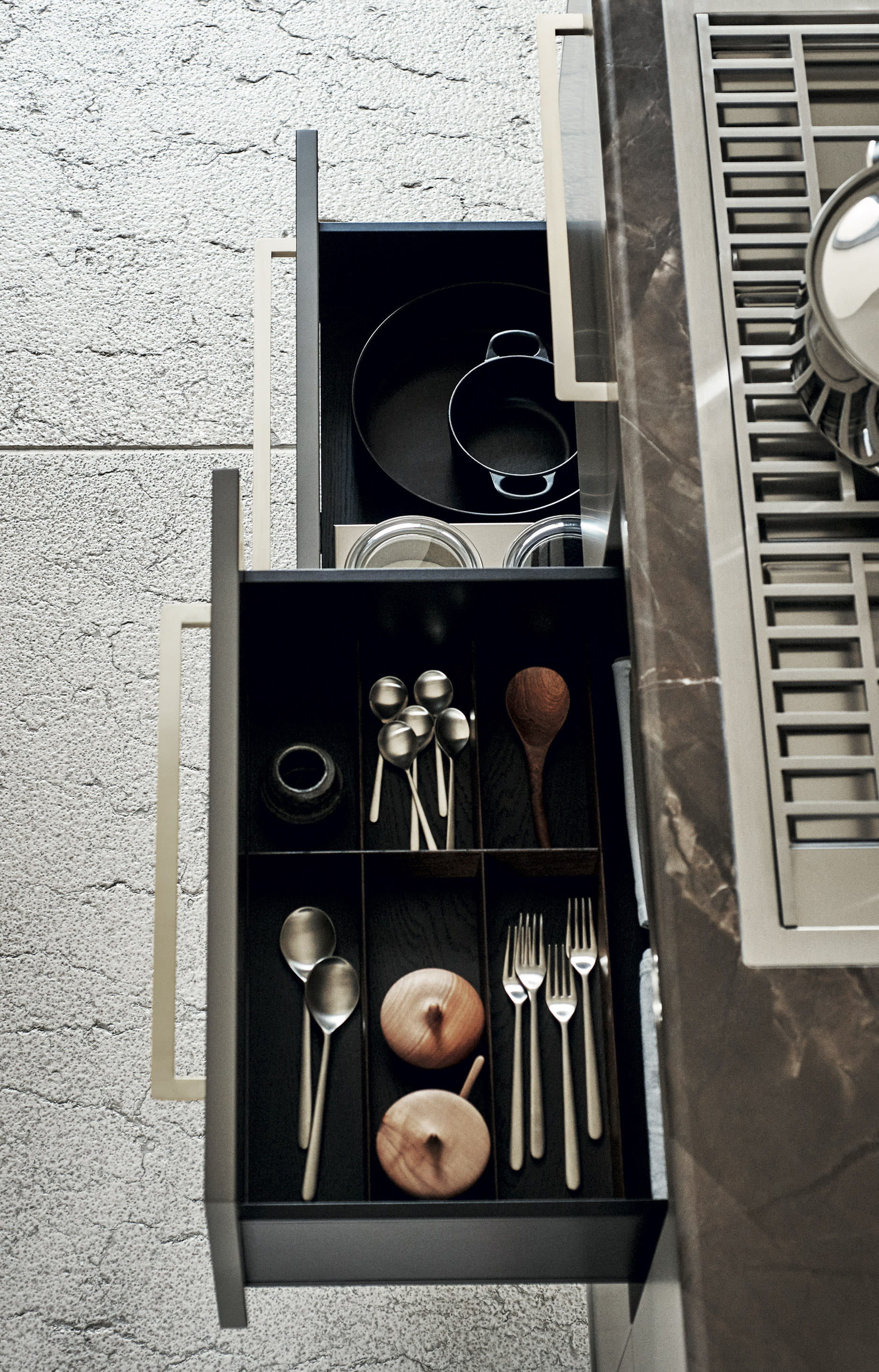 Parallèlement à « Allegoria#1 », la maison a présenté deux nouveaux projets, Unit et Wall Waiter, dessinés par le studio García Cumini et qui proposent une conception de l’espace cuisine encore plus simple, modulable et fonctionnelle. En un mot : contemporaine. Et toujours avec la même attention portée aux finitions et aux matières, laques métalliques, bois, mélaminés, métaux, mortier… « Des matériaux aussi bien techniques que naturels que nous travaillons en les associant de manière inattendue », précisent Cinzia Cumini et Vicente García Jiménez. Pour cette série d’éléments que l’on assemble à son gré en des combinaisons infinies, l’inspiration a été ni plus ni moins que celle des cuisines professionnelles. « Unit est un projet pont qui réunit des paramètres bruts et hautement fonctionnels et les combine aux exigences esthétiques du secteur domestique », confirme le duo de García Cumini. Pas d’angles ici mais, au contraire, un summum de douceur aussi bien dans les matières que dans les lignes, qui s’inspirent du bureau, de l’établi de menuisier ou encore du mobilier des années 50.