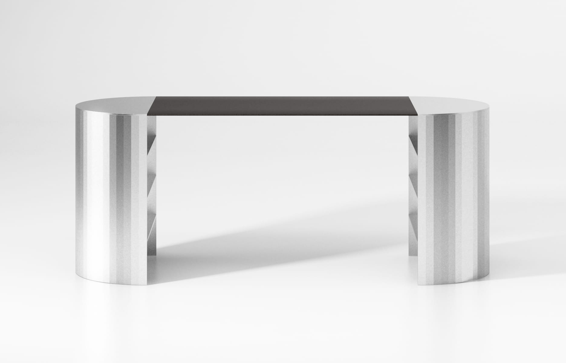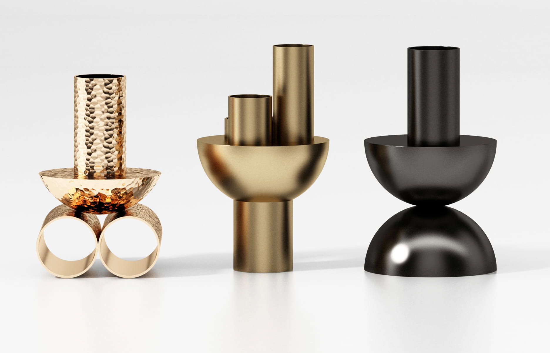 Au-delà d’un piétement original, la chaise et le tabouret du designer français affichent aussi des finitions alternant entre le cuir grainé, l’aluminium anodisé et le cuivre martelé. De quoi mettre en lumière les savoir-faire de l’atelier Pouenat, qui s’illustrent d’autant plus avec les pièces du studio Pool. Les vases Assemblages multiplient les options de matières, de textures et de rendus, quand le bureau Barrel, en aluminium cintré, « utilise la rigueur de sa construction comme un ornement ».