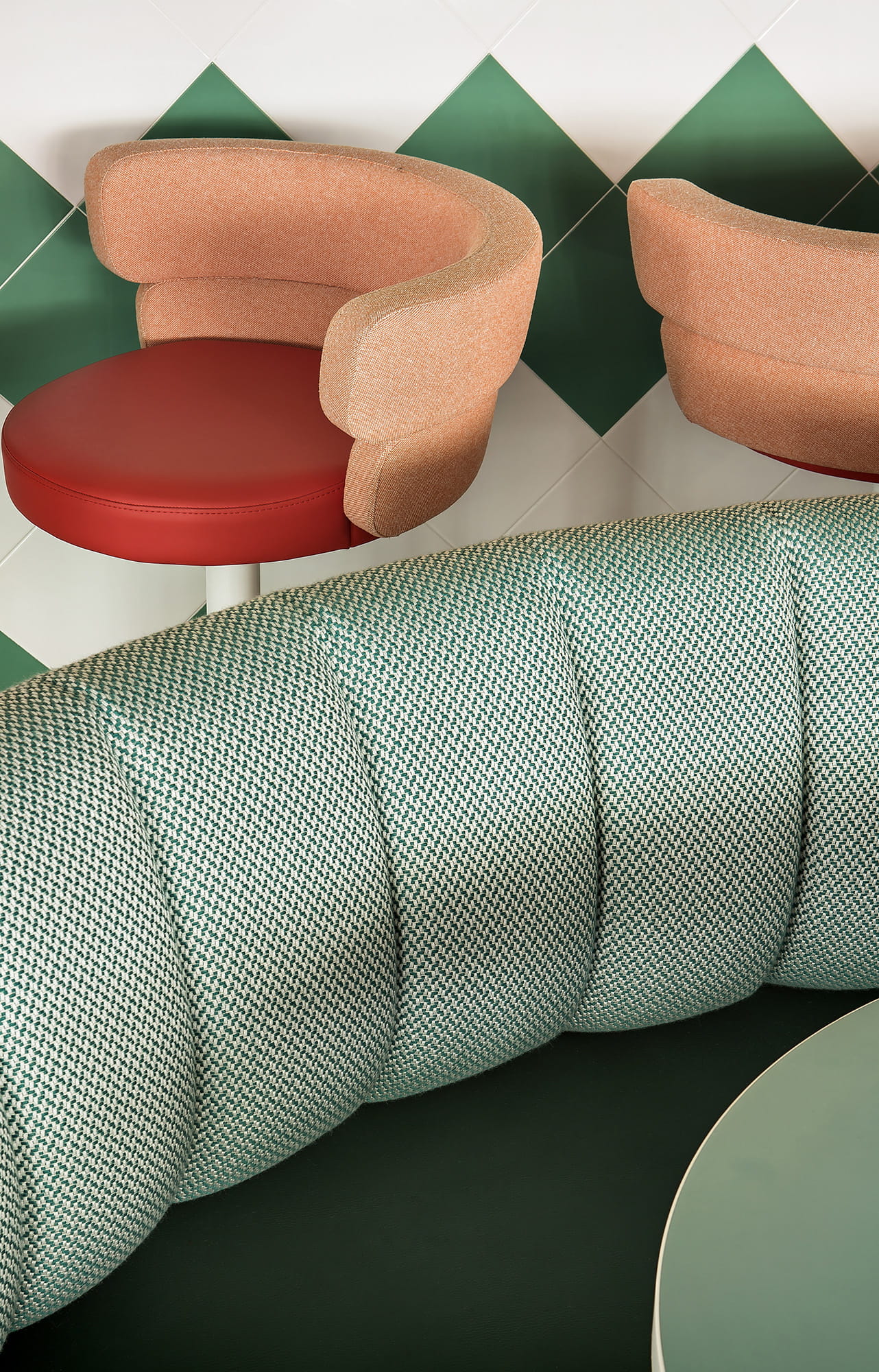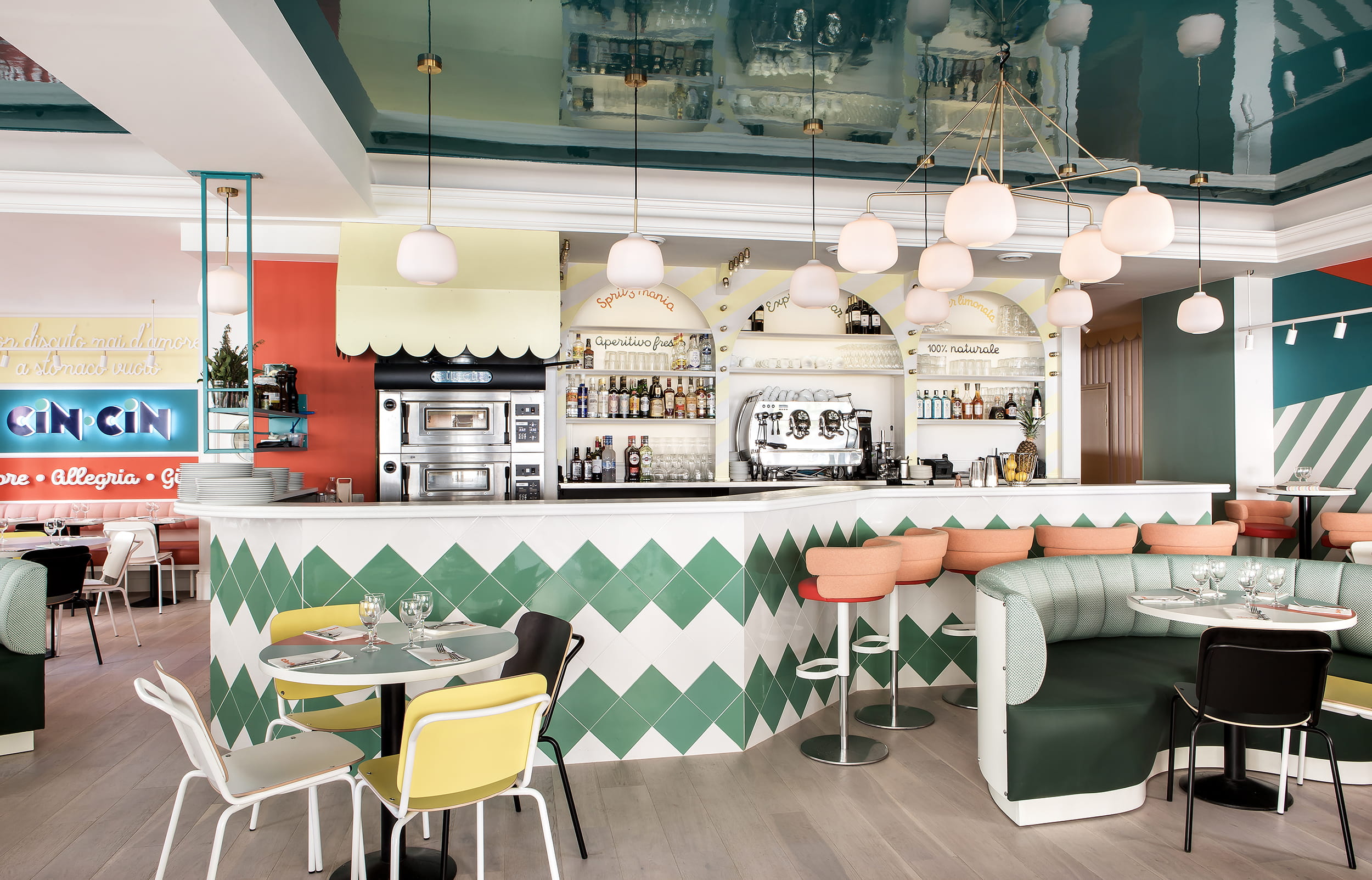 A peine avons-nous mis un pied chez Cin Cin que le regard s’affole. Les inspirations se choquent et se répondent. Elles sont généreuses dans les rondeurs des assises, des luminaires, des alcôves… mais aussi piquantes, notamment sur les murs, habillés de couleurs pop et rythmés de lignes graphiques. Les tissus sont signés Pierre Frey, les tables s’habillent de marbre de Carrare, le plafond, profond et laqué, révèle le va-et-vient des serveurs qui soutiennent le rush du midi, pizza ou plats de pâtes au plateau.