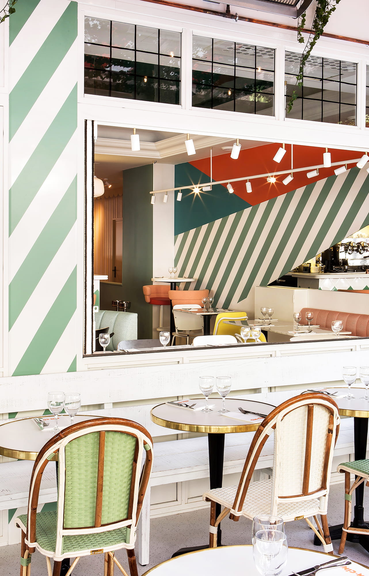 Ce qui frappe chez Cin Cin, c’est qu’au premier abord, il est impossible de savoir où l’on met les pieds. D’abord le nom. Il pourrait sonner asiatique, mais c’est plutôt à l’italienne qu’il faudra le prononcer (« tchin tchin »). Un coup d’œil à la carte confortera d’ailleurs cette idée. Michael Malapert, qui signe l’architecture intérieure et la décoration, nous confie que l’énergie dégagée par le lieu est un clin d’œil aux stations balnéaires italiennes des 70s, les stores de ses glaciers, les parasols de ses plages… Une Italie légère et joyeuse, un vent de fraîcheur loin de la vague rétro des restaurants du Big Mamma Group.