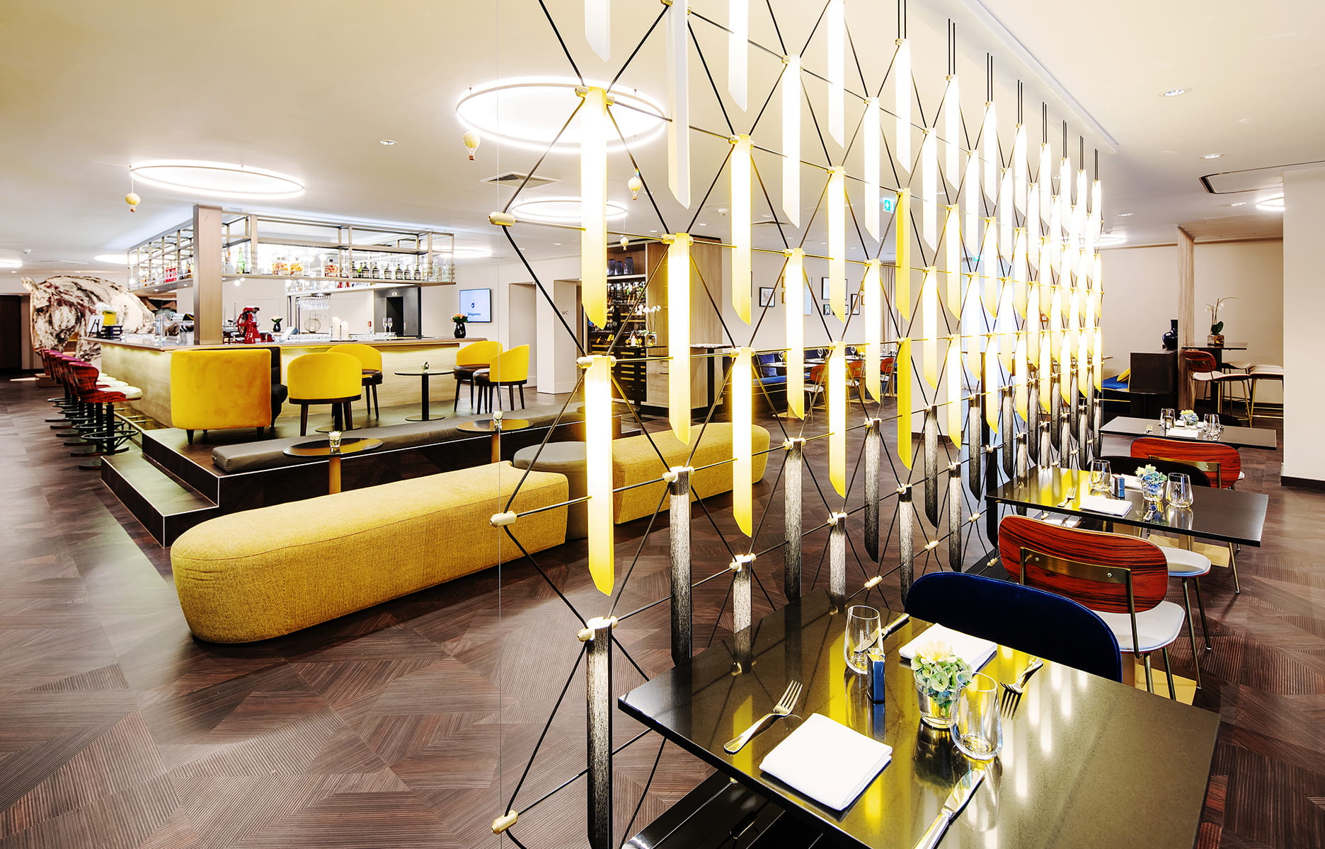 Montant en gamme, l’hôtel Mercure Bregenz, en Autriche, a fait place au Grand Hotel Bregenz – MGallery Collection. Cette transformation, qui a nécessité plusieurs mois de travaux, a donné naissance à un lieu au bord du lac de Constance, sous le pilotage d’Anne Balaresque, design manageuse de Grape Hospitality, l’opérateur et propriétaire du site. Pour mettre en scène les espaces du lobby, elle a choisi le panneau Mozaik, de Davide Oppizzi, chez Designheure, en réalisation sur mesure. Avec ses modules colorés et son graphisme, il apporte une signature lumière et sépare avec légèreté et élégance le bar du restaurant.