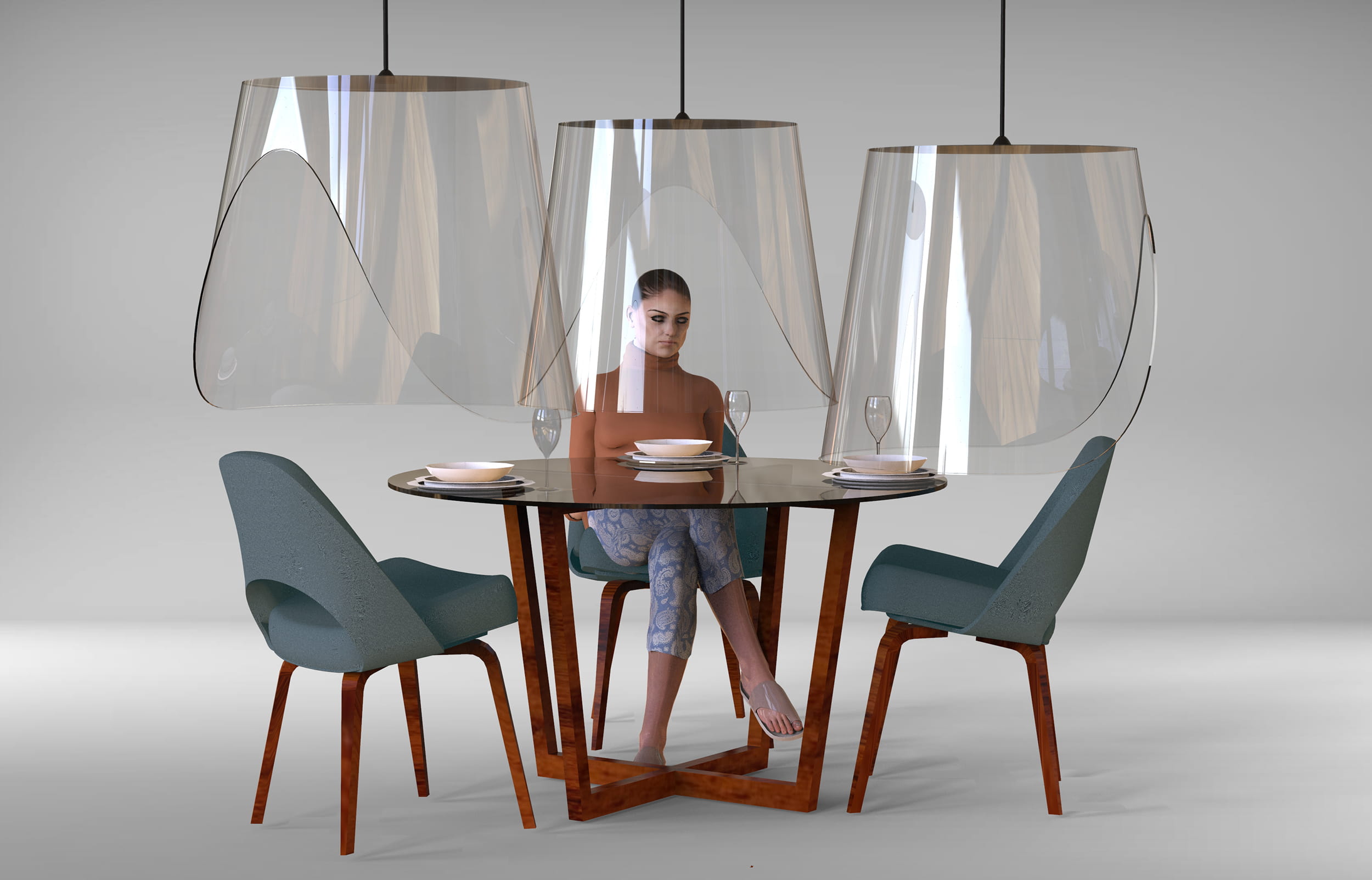 Christophe Gernigon, co-créateur du label français Designer Particulier, met toujours un point d’honneur à lier esthétique et ergonomie dans ses projets. Avec Plex’Eat, chaque convive est placé sous sa propre coupole de Plexiglas, à l’abri des dangers de sa table mais aussi de ses voisins. Pensée pour un maximum de gain de place, la cloche se fixe au plafond et s’ouvre élégamment sur l’arrière pour laisser à son hôte une certaine sensation de liberté. A la fin du service, ces visières taille XXL se détachent de leur fixation pour être lavées et désinfectées. Si la notion de convivialité si chère aux Français en prend un coup, Plex’Eat séduit déjà les marchés internationaux, et en particulier l’Asie.