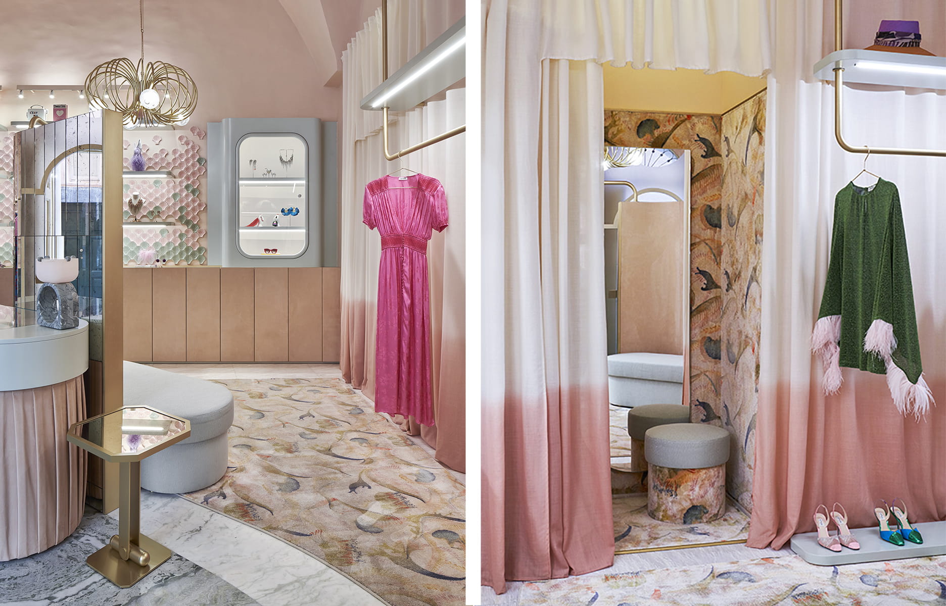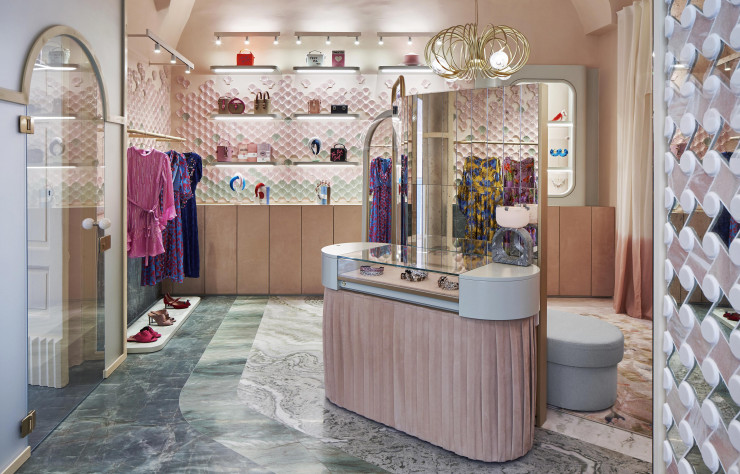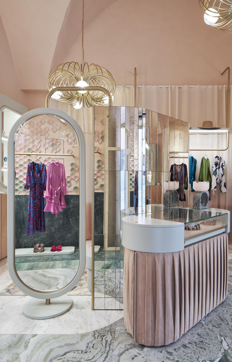 Evocation subtile des reflets aquatiques, les miroirs sont littéralement au cœur du projet. Qu’ils pivotent sur un axe ou composent les facettes d’un paravent, ils articulent les différents espaces de présentation, composés d’étagères rétro-éclairées ou de portants suspendus en laiton, avec une partie réservée aux essayages. Sous une des suspensions Pulsar, dessinées par la créatrice milanaise pour l’éditeur Esperia, le tapis qui la délimite envahit les parois des cabines afin d’apporter un peu de chaleur et de contraste dans cette « grotte contemporaine ».