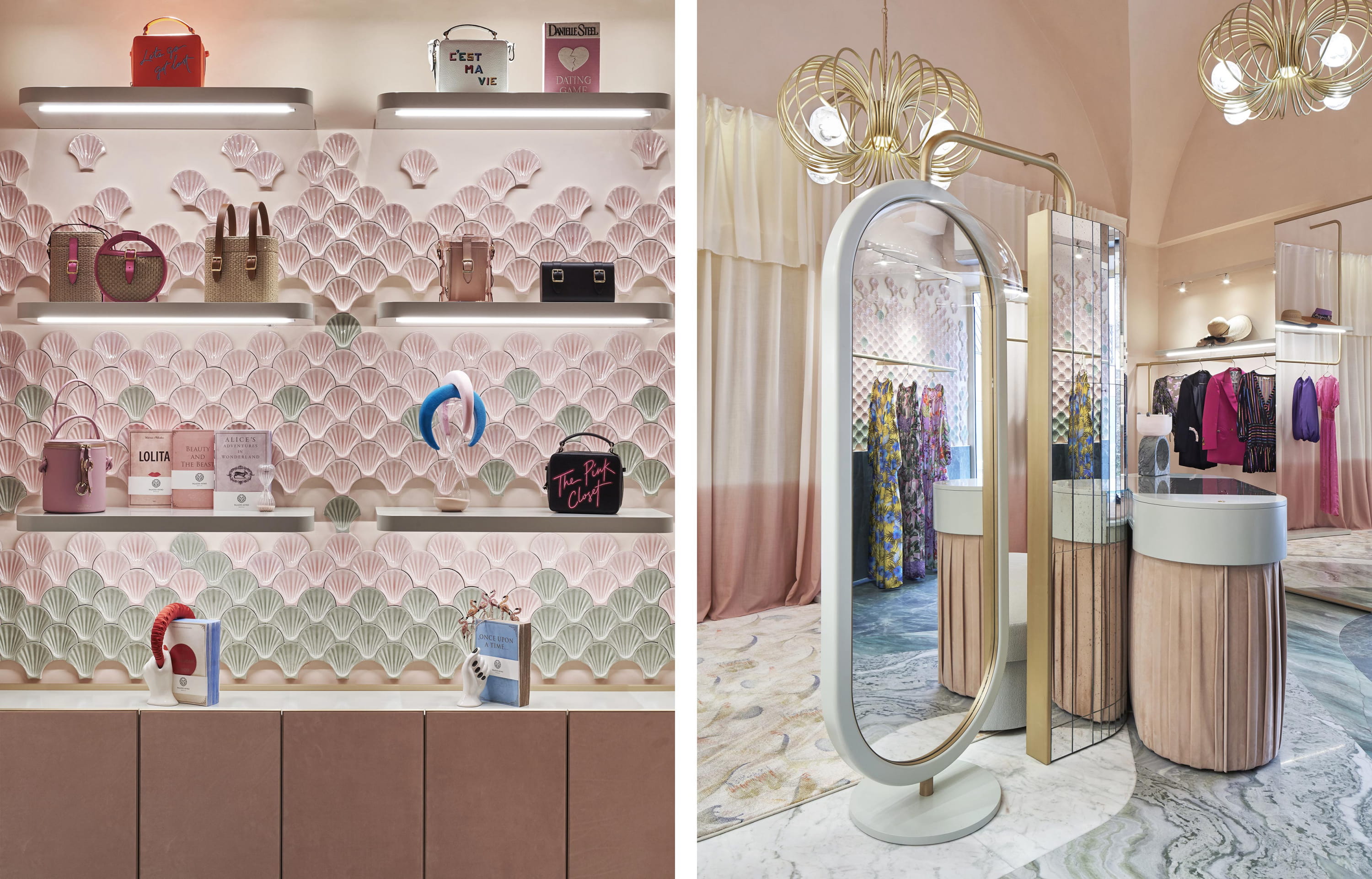 Face à la Méditerranée, la boutique tire son nom – et sa décoration ! – des façades rosées de la bâtisse. Mais s’il dialogue avec son architecture, le lieu s’accorde également à son environnement naturel en multipliant les références à la Méditerranée. Au sol, le marbre dessine des vagues abstraites et polychromes, passant d’un « vert aquamarine » à un « rose égéen ». Tandis qu’au mur, des coquillages saint-jacques en céramique déclinent les même tonalités de manière aléatoire, en réponse au motif géométrique d’une mosaïque en marbre et miroirs.