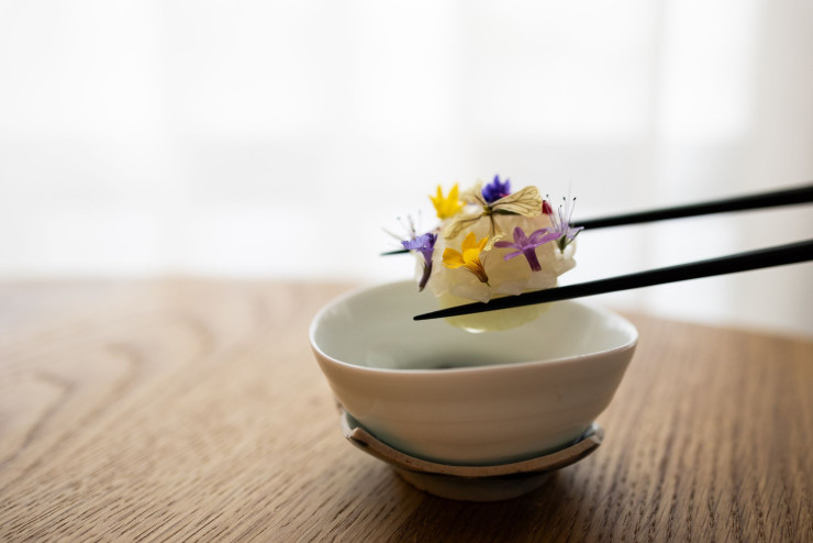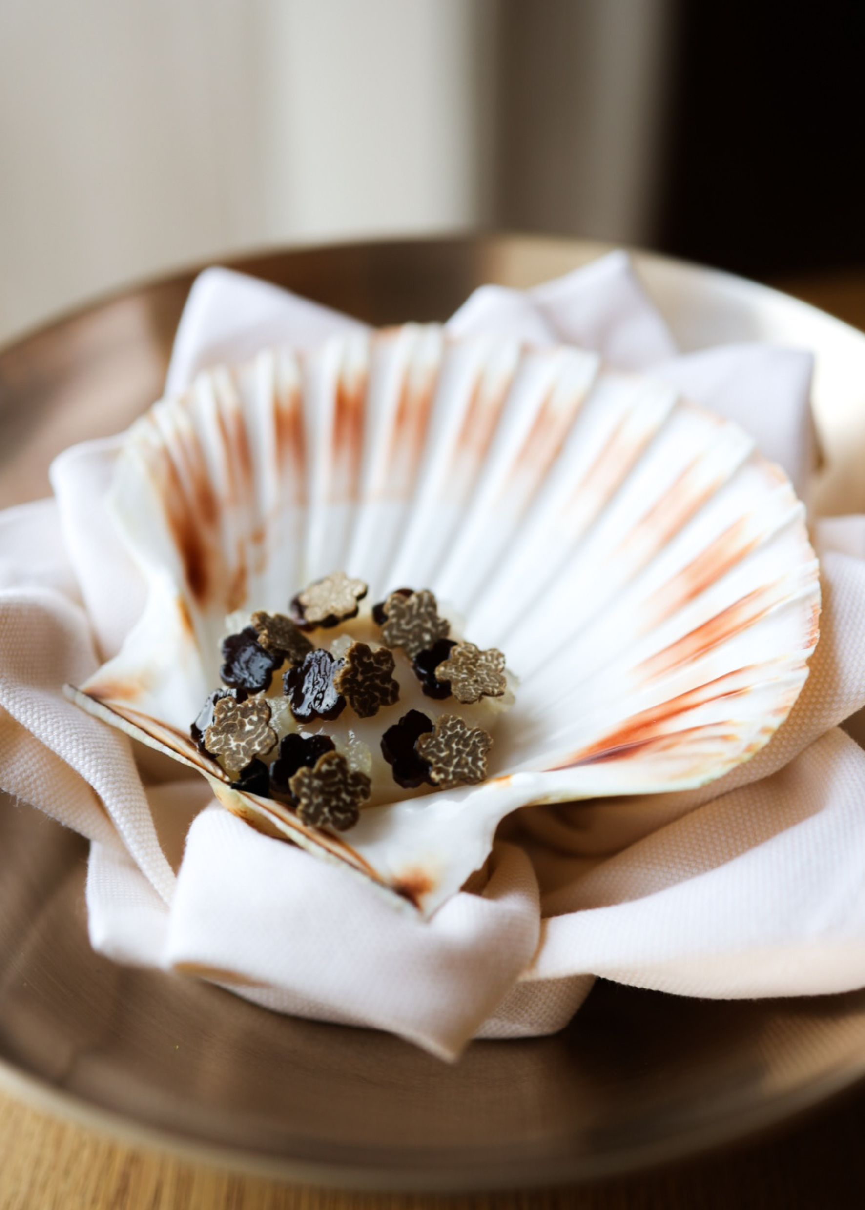 Pour chaque plat, une assiette, un bol, destinés à mettre en valeur la beauté des dressages. Un terre-mer inoubliable: langoustine norvégienne et bœuf séché au kimchi habillés de feuilles d’oxalis, un tofu et caviar européen ou encore un délicat kimchi blanc, servi dans un petit bol confectionné par un artiste coréen à partir de fragments de poterie de la dynastie Qing.