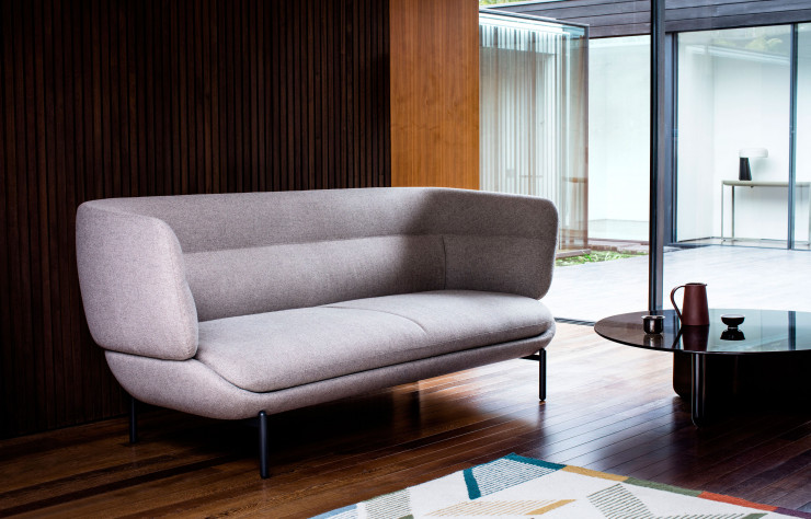 Haut dossier du fauteuil Nami ou accoudoirs de bois clair du siège Mudra, « il y a quelque chose de sensuel dans toutes ces pièces qui fait qu’elles fonctionnent bien ensemble. Mais elles sont aussi assez fortes pour habiter l’espace en solo. Nous les avons conçues pour un aménagement flexible de l’espace » avec, entre autres, la console Ballet, une nouvelle typologie pour eux, ou la lampe Falcon, une élégante et lointaine cousine de la Snoopy de Pier Giacomo Castiglioni (Flos).