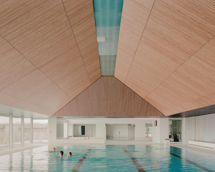 Le projet inclut également la construction d’un nouveau bassin relié à celui d’origine et imaginé comme une grande boîte vitrée. “Nous voulions valoriser les vues dégagées sur l’horizon et cette topographie en centre-bourg”, explique l’architecte. Un jeu de transparence qui permet aux nageurs d’apercevoir les enfants jouer au foot et les retraités en pleines parties de cartes.
