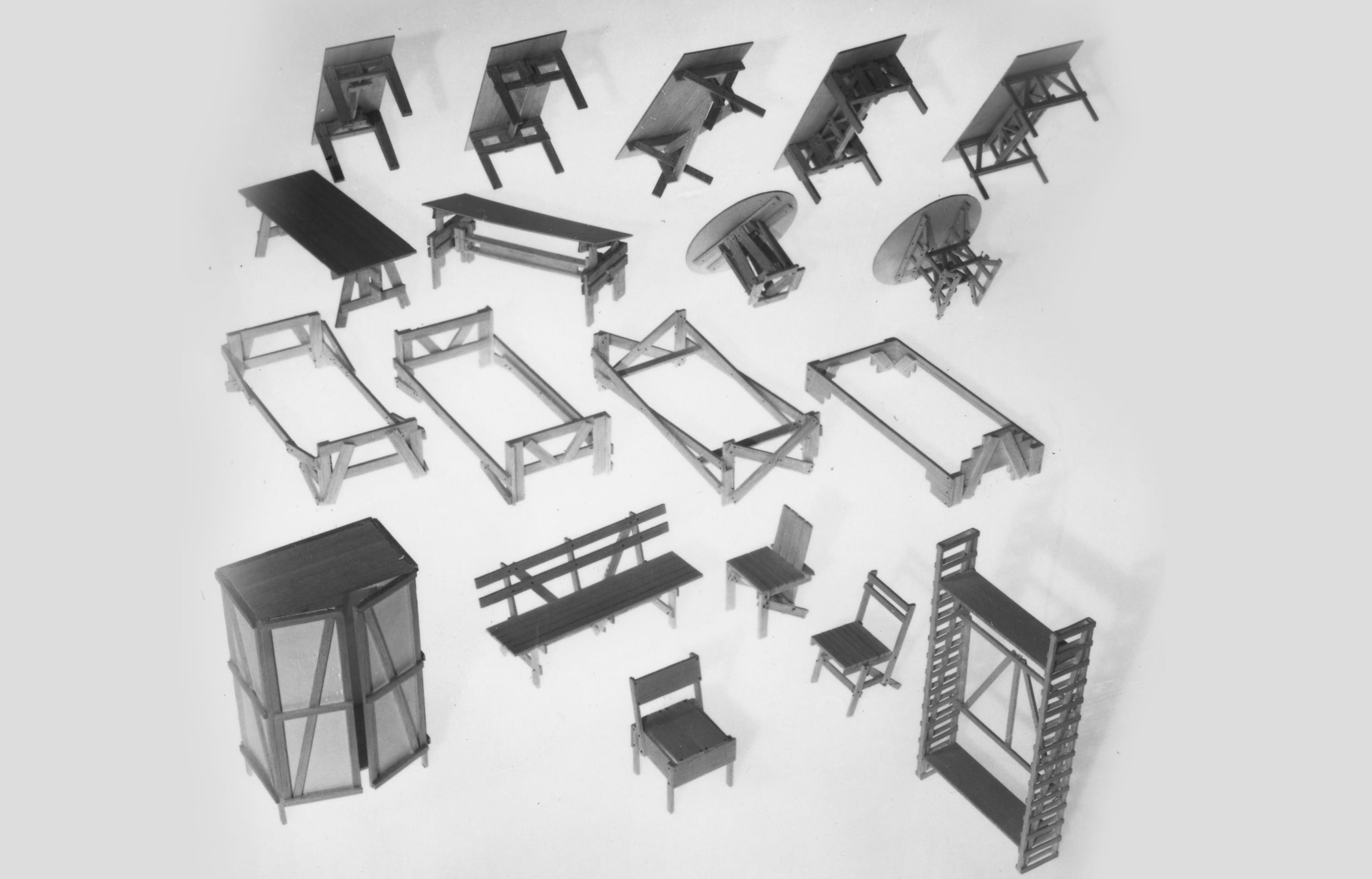 Une pensée économe qui déroule ses atours tout au long de l’exposition, de la série « Putrella » – des centres de table en acier pour Danese – jusqu’au travail sur la porcelaine en passant par les ensembles modulaires en carton, des systèmes de mobilier qui jettent un regard précurseur sur ce matériau durable. Projets, maquettes, mais aussi dessins et gravures jalonnent un accrochage qui s’arrête particulièrement sur Autoprogettazione, un ouvrage en forme de manifeste, véritable ancêtre du DIY (do it yourself, « fais-le toi-même »). On y retrouve les instructions et quelques exemples de cette collection de meubles en bois dont Enzo Mari a dessiné les plans en 1973, invitant chacun à s’emparer d’une scie et d’un marteau pour réaliser du mobilier dans un esprit de vertueuse décroissance.