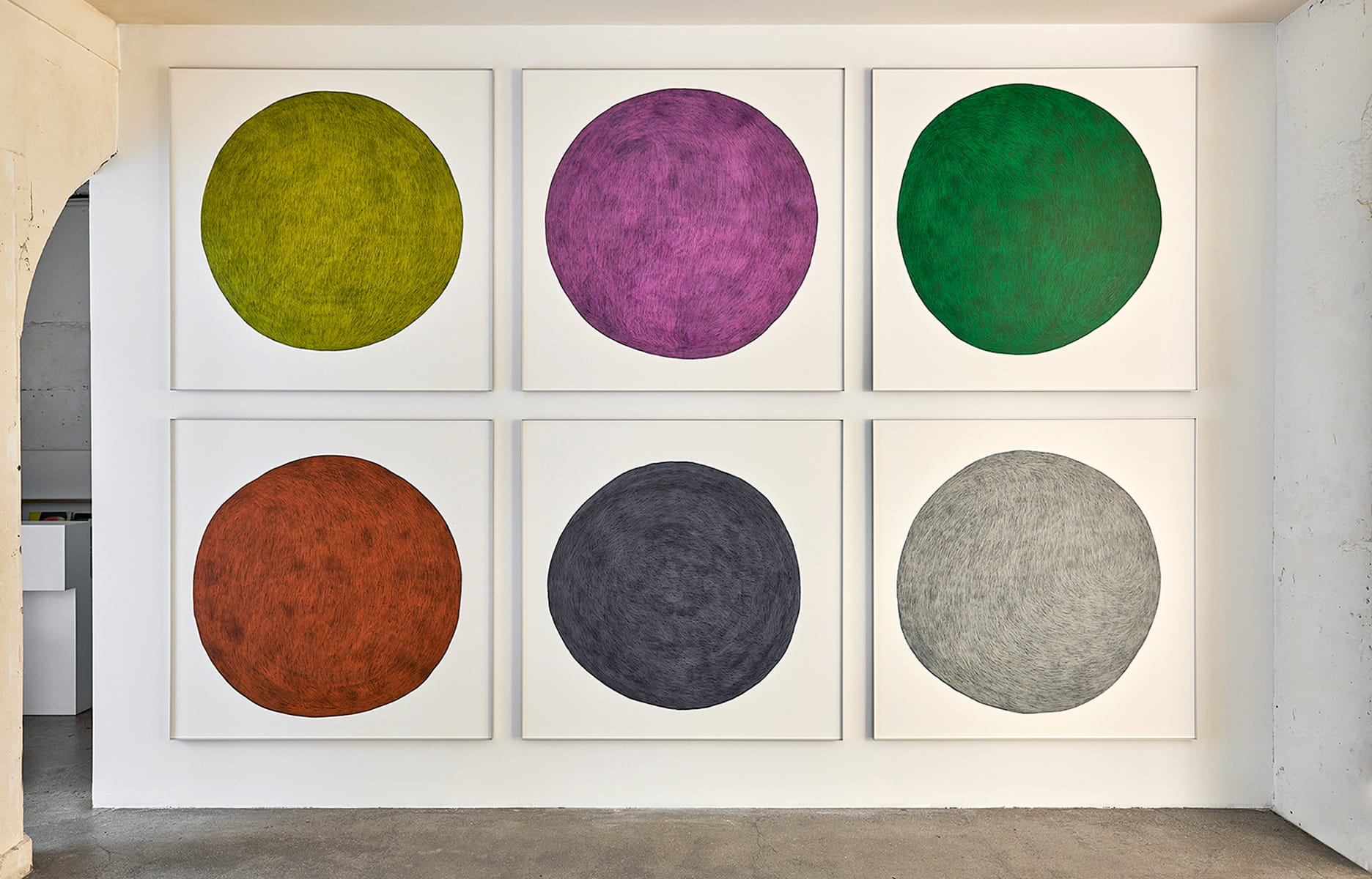 Réalisés à l’encre de Chine et aux crayons de couleurs, six grands cercles accueillent les visiteurs et évoquent d’emblée les recherches de Pierre Charpin autour des formes et des couleurs. Dans cette nouvelle exposition, elles deviennent sujettes à des variations successives pour interroger les mécanismes qui façonnent notre perception et notre ressenti, tout en développant une certaine esthétique de la répétition.