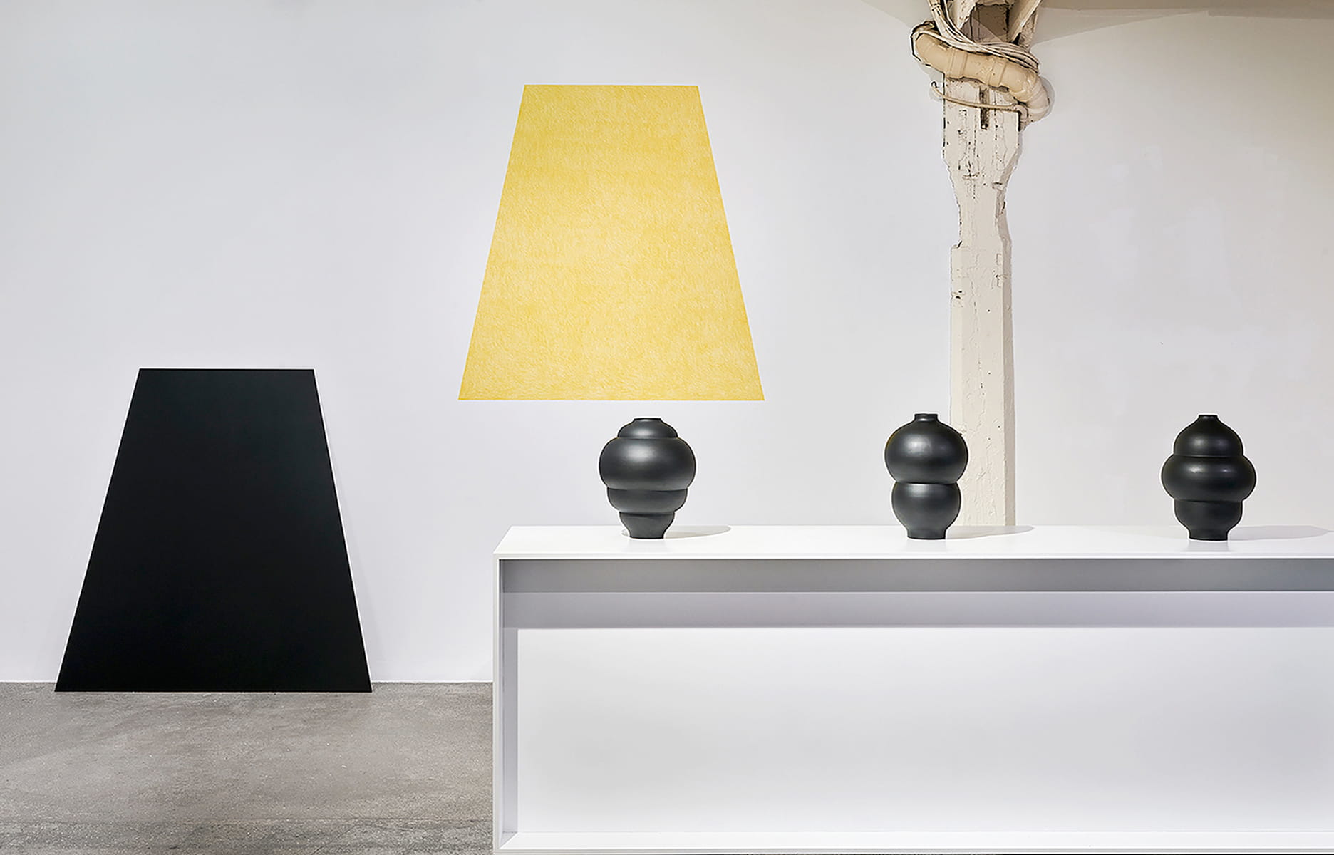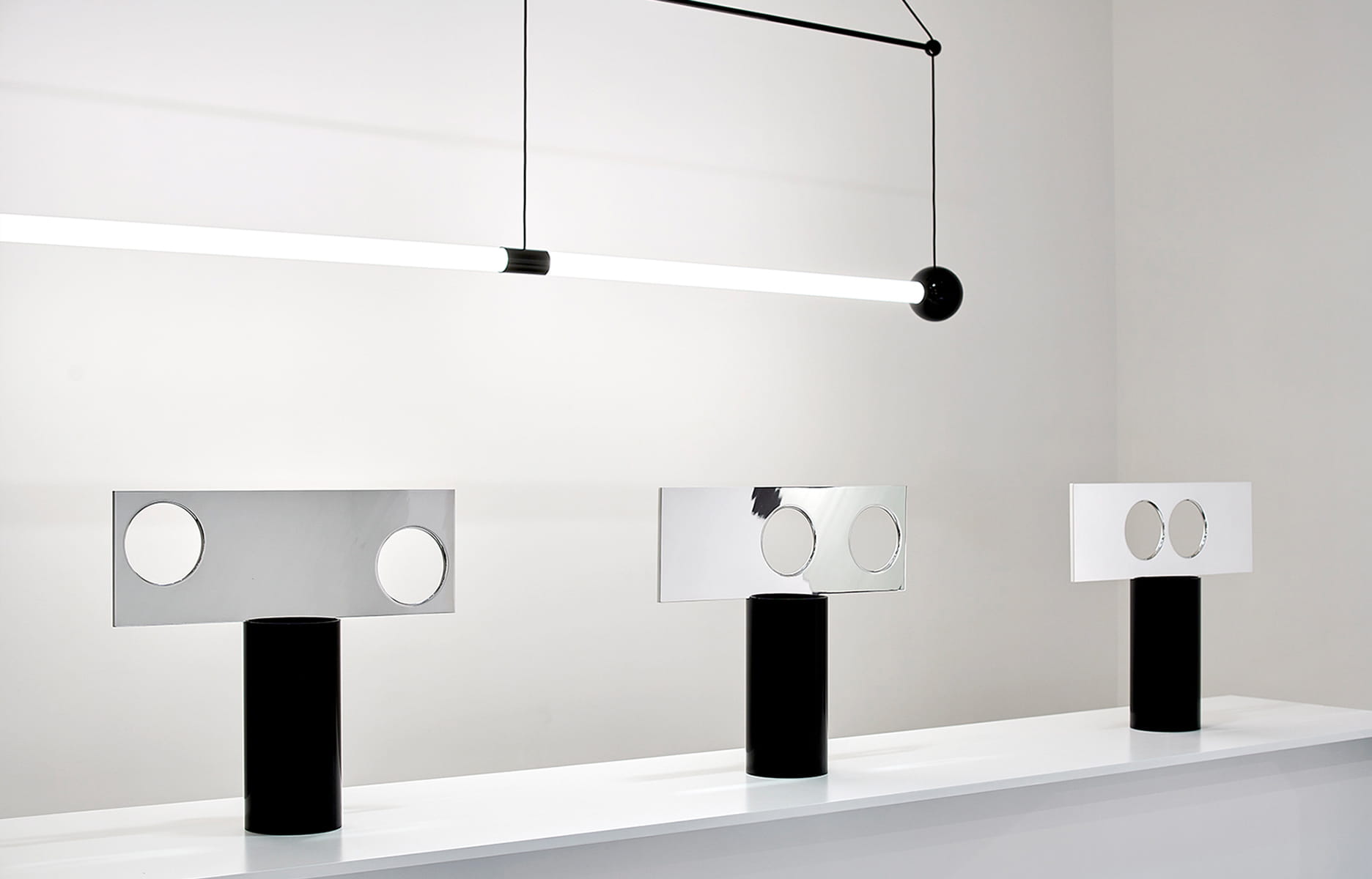 Accumulations de courbes rebondies, les vases Plump revisitent de façon généreuse le langage visuel du créateur, souvent simple et ludique. A l’exemple des vases Lunettes, pensés comme de purs exercices de composition avec un vocabulaire formel qui se restreint au cylindre, au cercle et au rectangle. Présentés dans la seconde partie de l’exposition, ces trois modèles en aluminium font écho à la géométrie rigoureuse du plafonnier Trapeze, dont les sphères et les tubes de lumière s’articulent en cadrant l’espace.