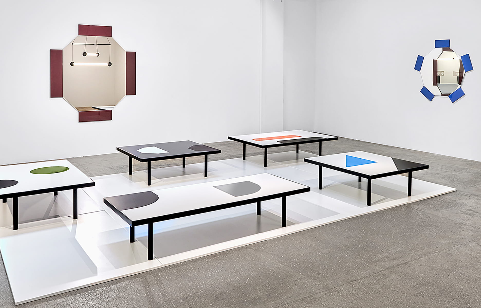 Avec les miroirs Satellite, l’imbrication des formes et des matières se poursuit dans un nouveau dialogue contrasté. Leurs surfaces réfléchissantes tranchent avec les couleurs de leurs contours, à la fois ouverts et fermés par des panneaux en bois laqué. Chaque modèle se distingue par sa morphologie et sa propre teinte, tout comme les dessins qui rythment les tables basses Translation, véritables pièces maîtresses de l’exposition.