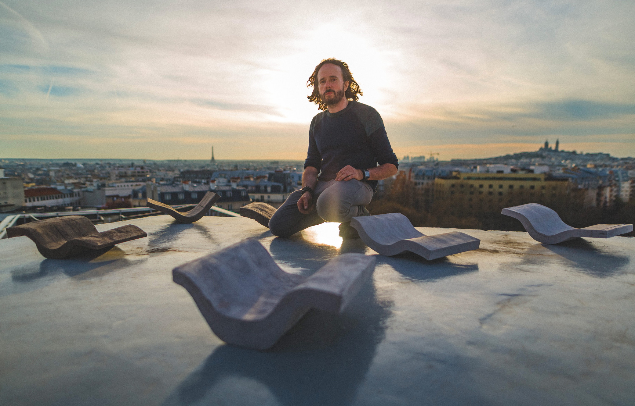 Durant quatre ans, il se forme d’abord au paysagisme à l’École nationale supérieure de Versailles puis à l’art subtil de la terre cuite au Japon. Il entame ensuite une série de résidences qui lui permettent de concilier ses deux passions. Dans le fleuve Los Angeles, un cours d’eau entièrement domestiqué qui traverse la mégapole, il crée des compotiers inspirés des lieux. Embarqué sur la péniche parisienne aménagée par Le Corbusier, il sculpte une série de théières en béton qui rendent hommage au maître du brutalisme. Et l’an dernier, à nouveau dans la capitale, il a passé deux mois (en plein hiver !) sur le toit du siège du PCF d’Oscar Niemeyer. Il y a donné naissance à une nouvelle typologie d’objets baptisée « Tokonoma » : une vague de béton qui s’inspire des iconiques courbes de l’architecte brésilien.
