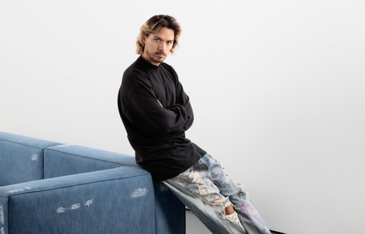 Harry Nuriev : Le canapé symbolise une façon de vivre très actuelle. Je l’ai imaginé comme un espace de réunion et de fête, comme une plate-forme sur laquelle on peut manger, regarder des séries, discuter, jouer aux cartes, travailler, faire une sieste et dont les proportions permettent de reconnecter les gens au sein du foyer et de se retrouver ensemble autour d’une activité. C’est un meuble décontracté, comme l’est le denim. Il y a une adéquation parfaite entre la forme, la modularité, l’usage et le revêtement.