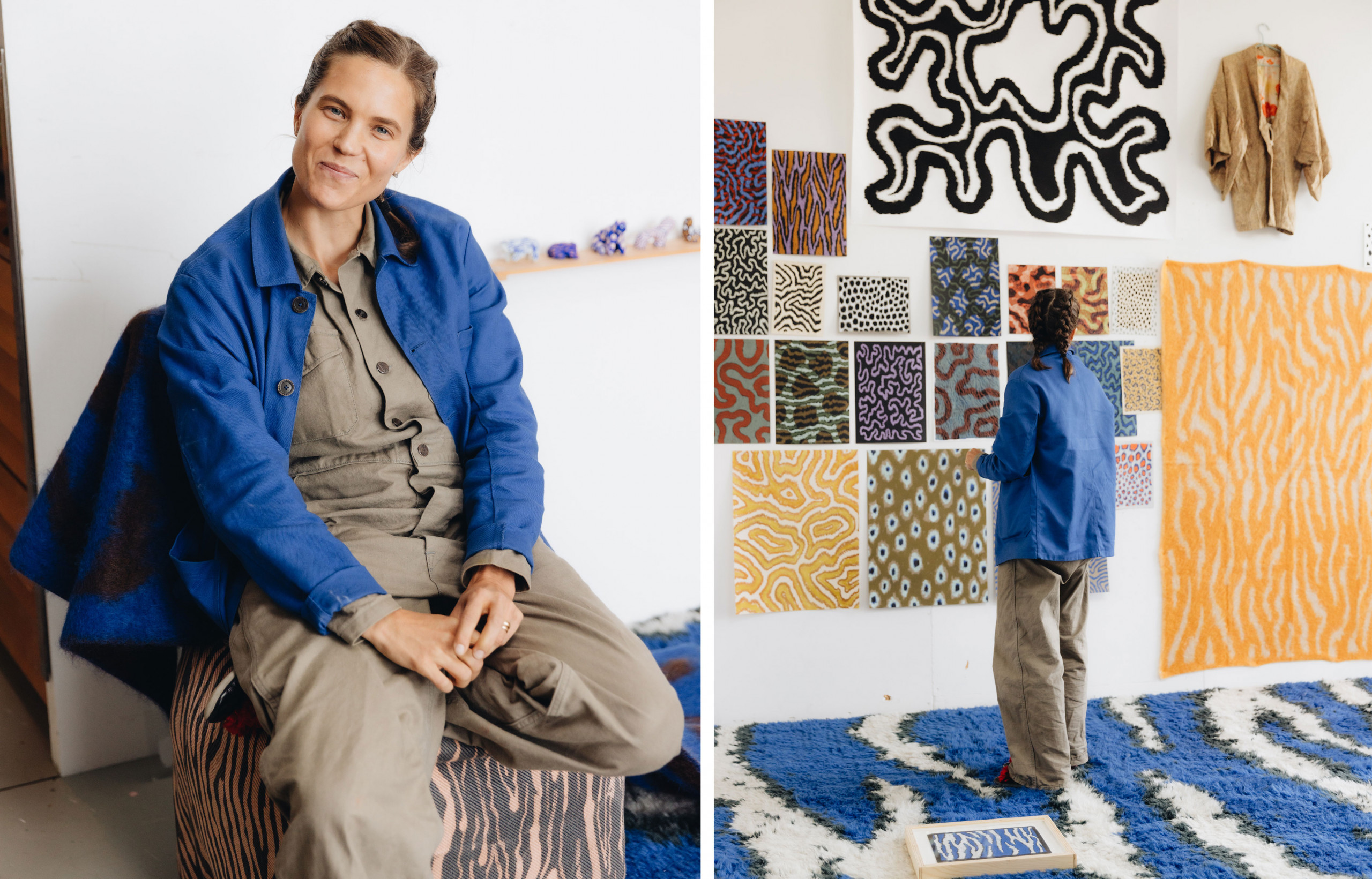 Cela tient à leur épaisseur touffue, sorte de flash-back amusé mais non nostalgique à la modernité sensuelle des années pop ou à celle, plus électrique des eighties ; ainsi qu’à leurs dimensions (350 x 250 cm) qui décuplent leur présence dans l’espace ; et, évidemment, à leur puissance graphique : des motifs de peaux de bêtes stylisés, surdimensionnés et coloriés. Une ode contemporaine à la nature, dessinée au pastel gras dans un premier temps par l’artiste, puis transposée en 3D avec des fils de laine noués : « La nature est toujours ma plus grande source d’inspiration. Je suis obsédée par ses motifs, ses couleurs et particulièrement par la façon dont les pelages d’animaux jouent la carte du camouflage pour mieux brouiller les pistes ou, au contraire, pour attirer. C’est vraiment cette fascination qui se cache derrière les motifs que j’ai créés pour Hem », affirme avec une passion sincère Siri Carlén.