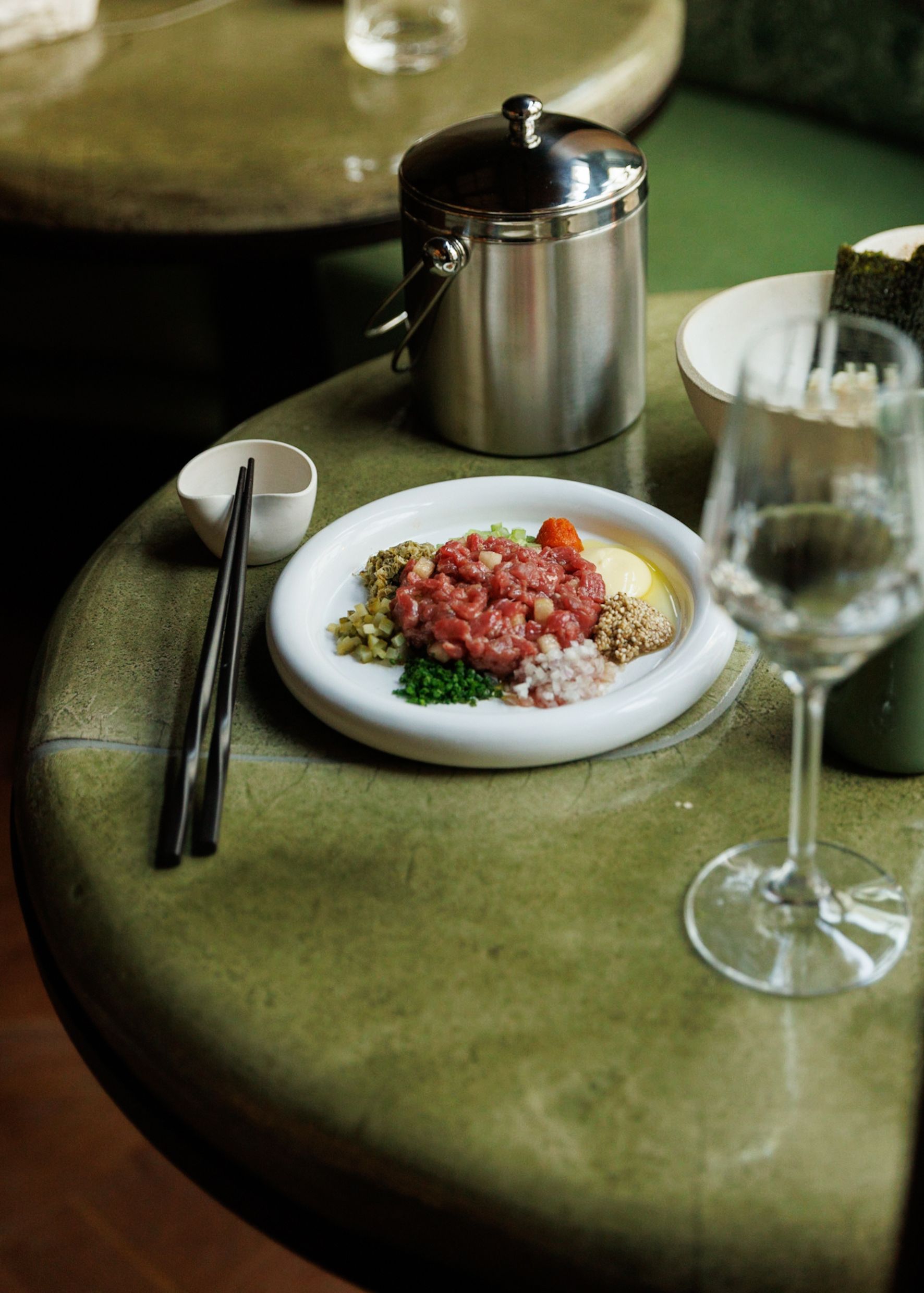 Côté bar, le jeu se poursuit avec notamment ce dry Martini (Akane Martini) revisité à l’aide d’un gin japonais, d’un vermouth sec infusé au baies Mack Khen et prune umeboshi en guise d’olive. « Dès le seuil franchi, on est embarqué dans un voyage, autant visuellement que gustativement très incarné », détaille Laura Gonzalez. Une ambition portée par le niveau d’excellence dont ont fait preuve les artisans sollicités.
