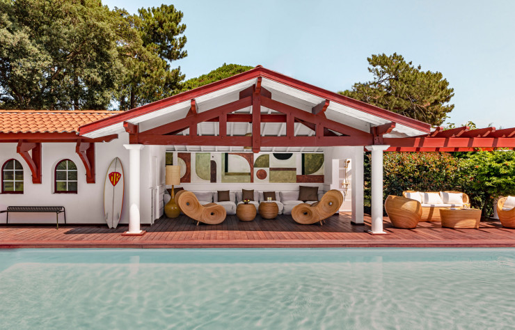 Depuis l’extérieur, Les Bords du lac est une belle construction néobasque, aux colombages rouge foncé et à l’architecture cossue, typiques des Landes. Intérieurement, c’est une demeure chic et chaleureuse, surprenante également, en accord parfait avec la tonalité « surf lodge familial » que l’architecte d’intérieur Dorothée Delaye a souhaité lui donner.