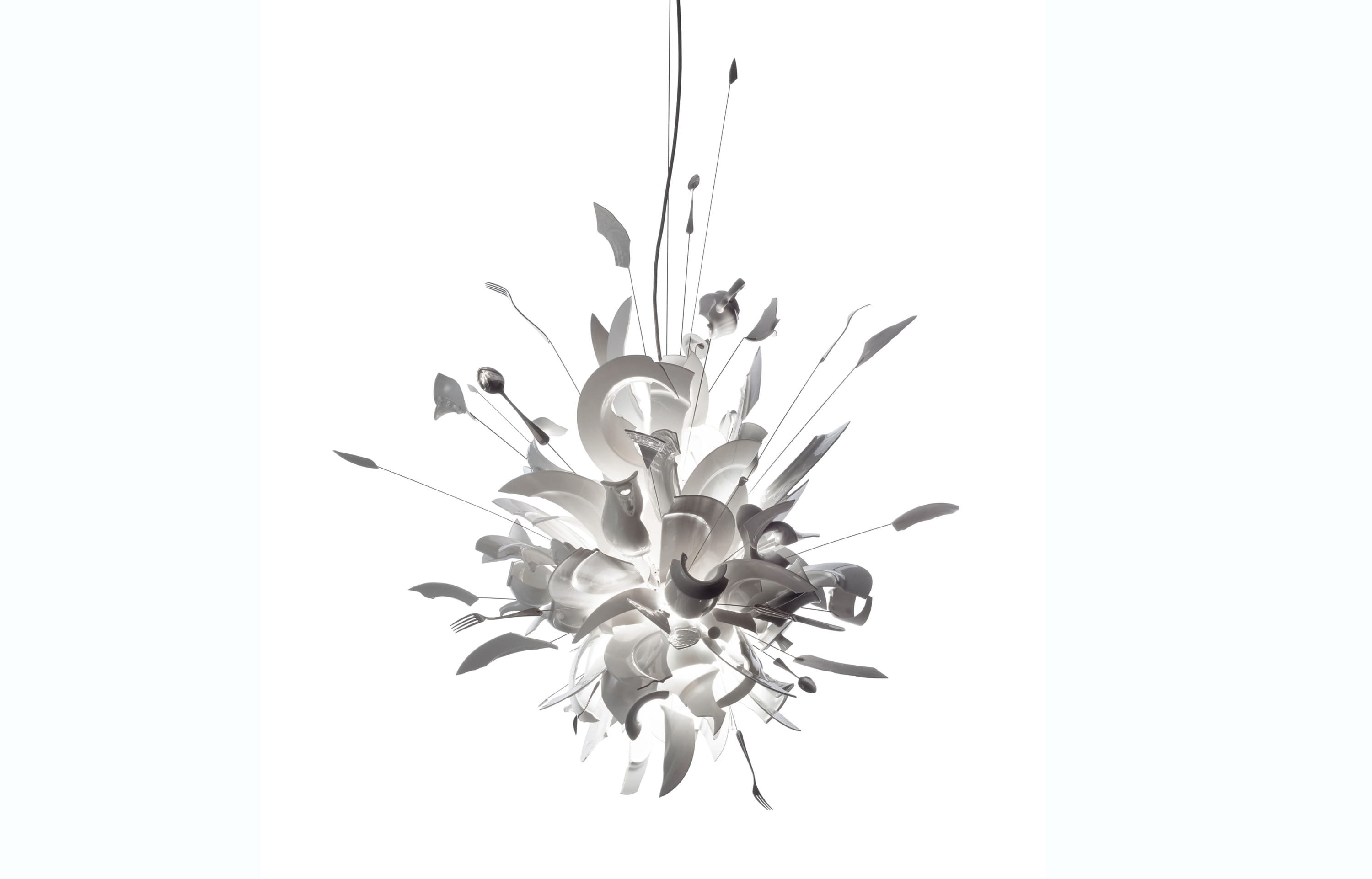 Plus tard, son célèbre lustre Porca Miseria! en éclats d’assiettes lui est inspiré par les explosions filmées dans Zabriskie Point, de Michelangelo Antonioni. Pour obtenir ce résultat (des morceaux adéquats au montage des lustres, tous uniques), les artisans de l’atelier suivent une façon particulière de casser les assiettes. Le premier exemplaire, présenté au Salon de Milan, appartient au designer Ron Arad, qui l’a tout de suite voulu ! Le label n’avait pas vocation à ne rester que munichois. Sa première galerie new-yorkaise – on peut vraiment dire « galerie » au vu de la créativité des lampes exposées – a inauguré la hype de Greene Street à New York.