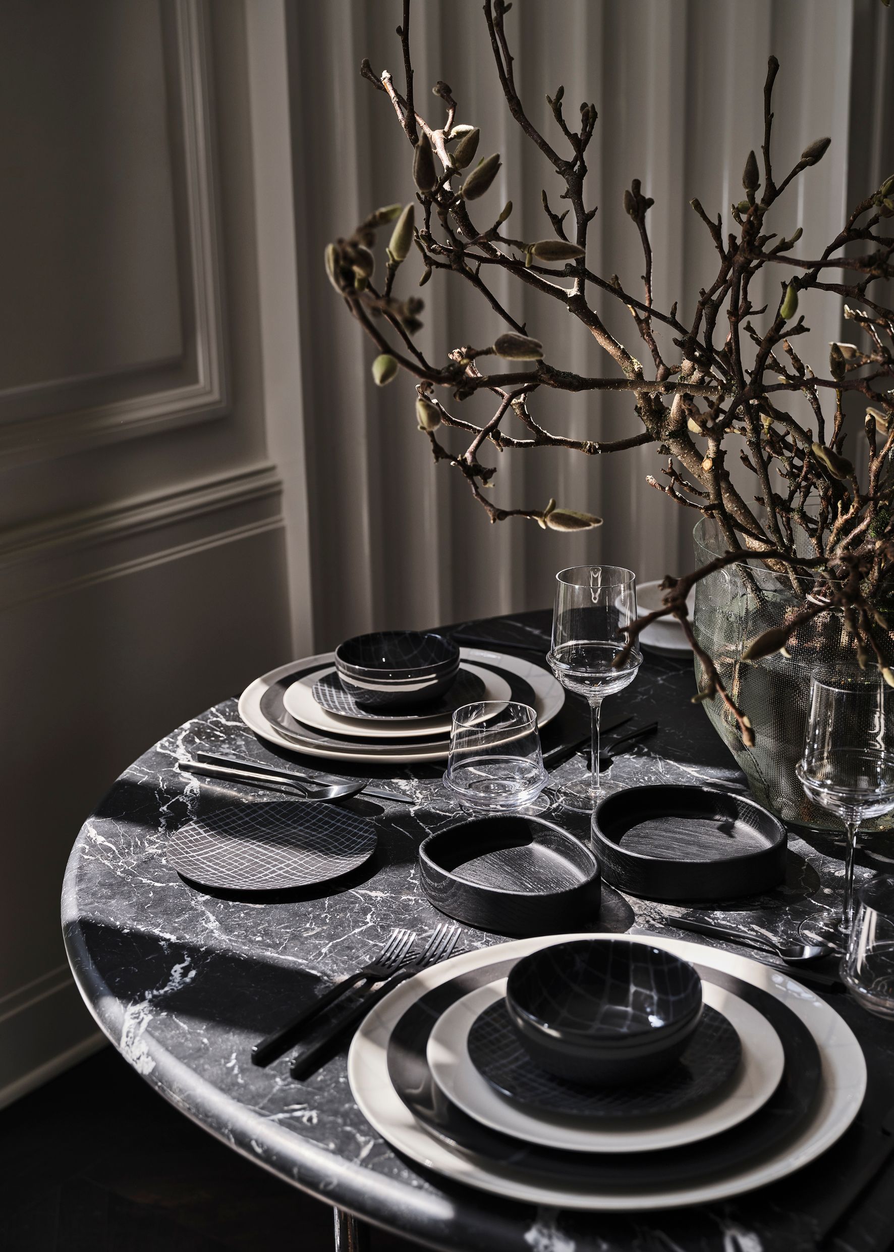 Sa proposition se décline en deux services, avec couverts et verrerie, et une série d’accessoires sculpturaux, en bois ou en marbre, qui rehaussent la scénographie de la table. Tout est sobre, mais sans rien d’ordinaire. Les verres affichent un dégradé de couleur ambre ou des arêtes en relief qui les singularisent. Le service Zuma mêle l’aspect artisanal de la céramique à plusieurs motifs de quadrillage numérique empruntés aux principes du Bauhaus, que l’on peut panacher en noir et blanc.