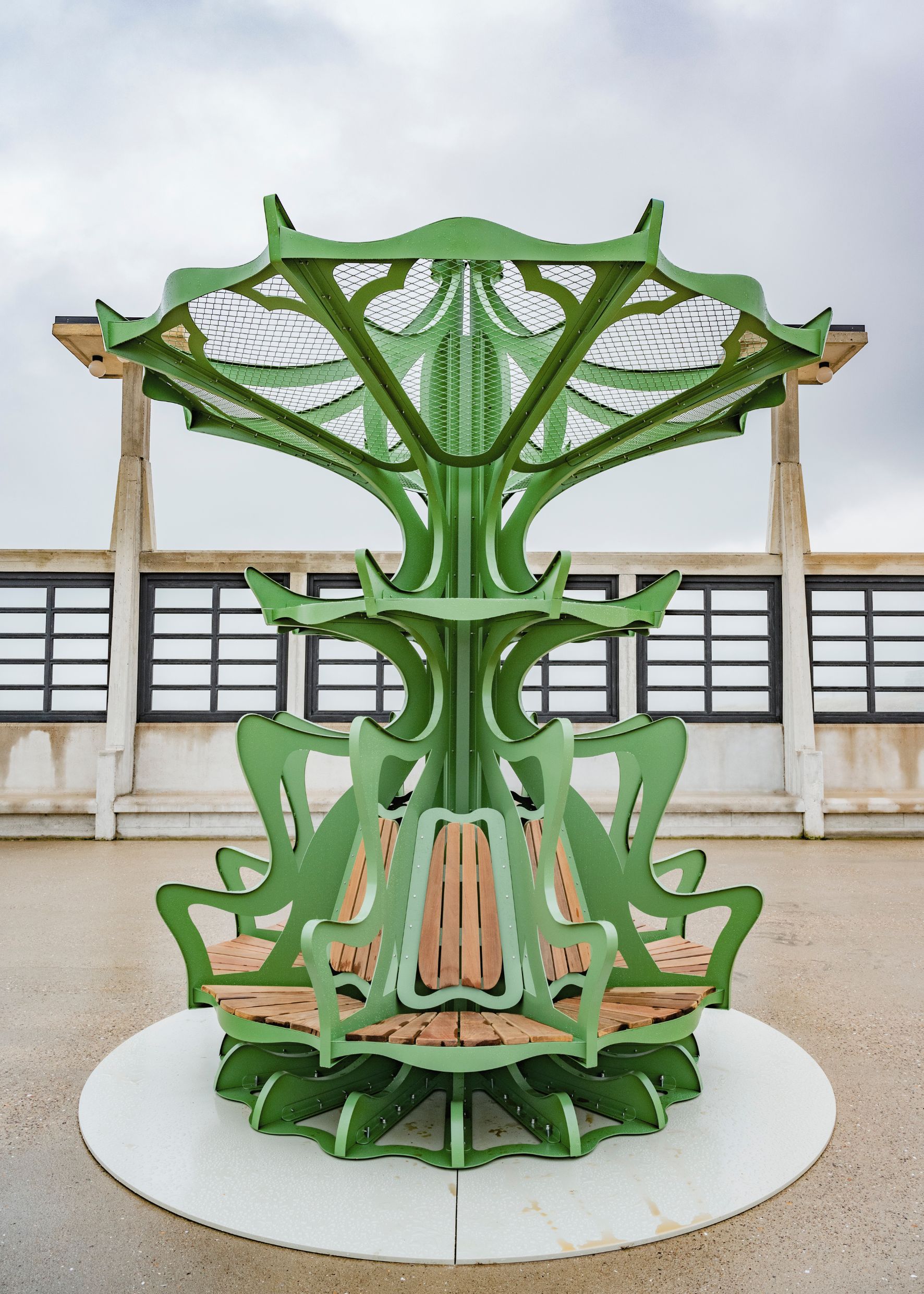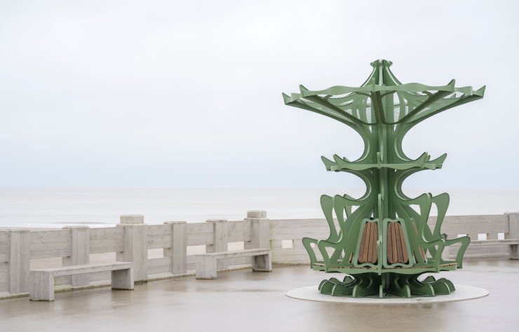 Ainsi, Romain Weintzem a conçu pour Blankenberge, station balnéaire réputée pour son architecture Art nouveau et sa jetée longue de 350 mètres, une structure composée de huit sièges qui se développent autour d’un axe central. Sa couleur vert réséda rappelle celle popularisée par Hector Guimard.