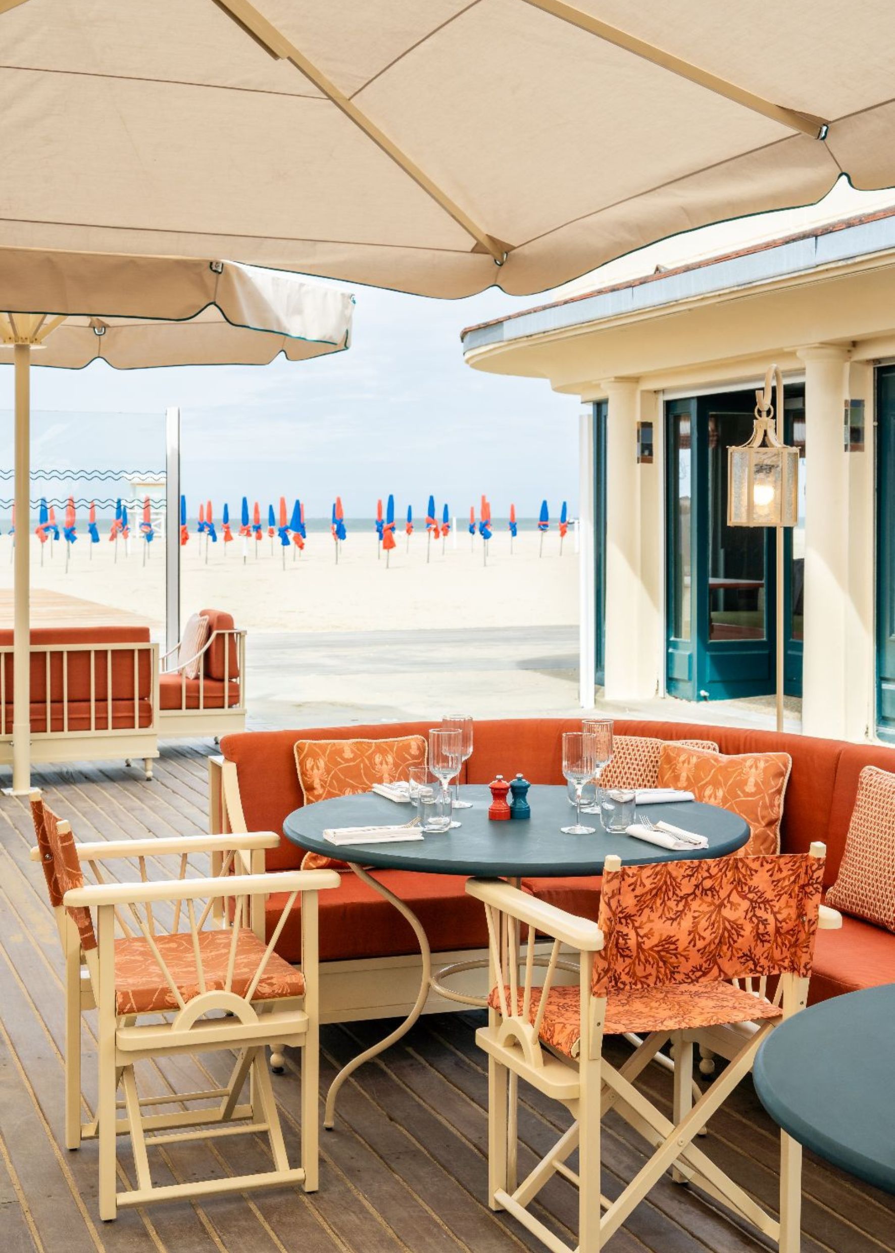 Situé directement sur les « planches de Deauville » – la fameuse promenade du front de mer construite il y a 100 ans et qui s’étend sur 643 mètres aujourd’hui –, à cinq minutes à pied du port, ce restaurant de plage est connu de longue date des habitués de la station balnéaire.