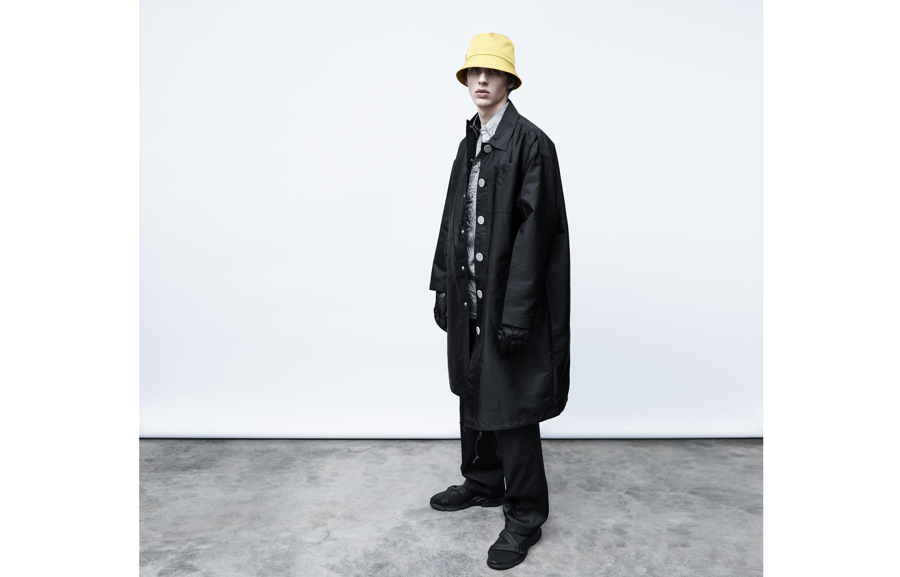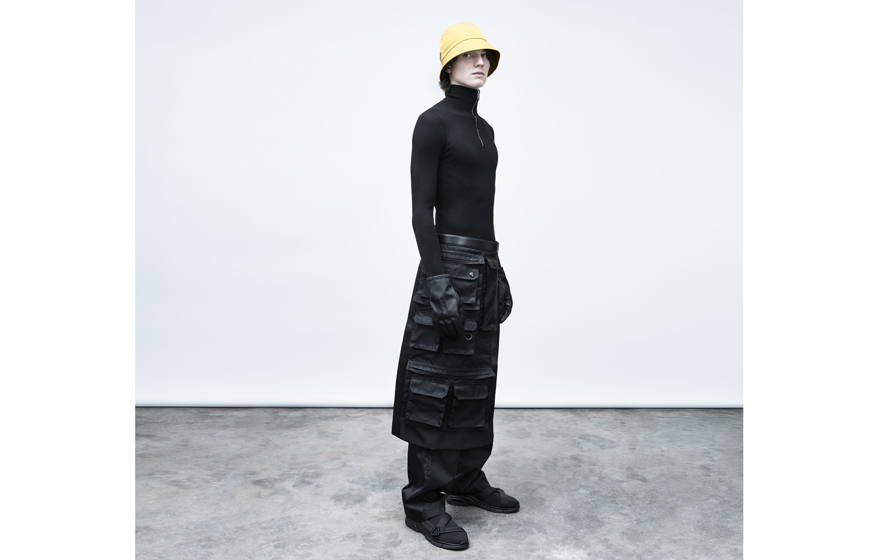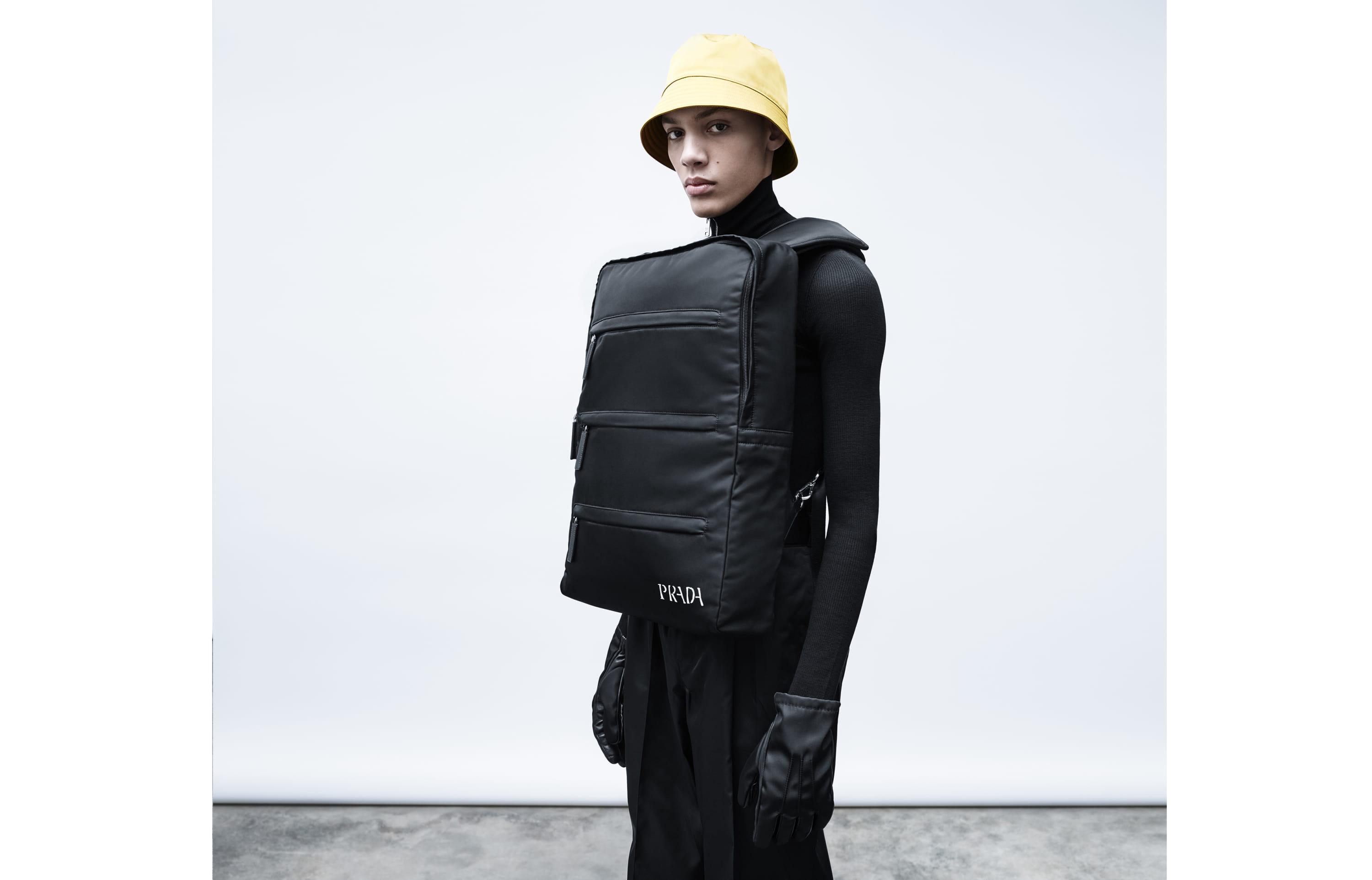 Enfin, Rem Koolhaas s’est amusé à « cartonner » une silhouette façon patron de couturière avant de concrétiser son modèle. Alors qu’il signe régulièrement le décor des shows Prada et qu’il vient d’achever la fondation milanaise, l’architecte a pensé fonctionnalité en inversant l’idée du sac à dos pour le muer en épais gilet, type pare-balles, positionné sur le torse pour éviter de se contorsionner pour y attraper quelque chose ou de tamponner les gens sans s’en apercevoir. Tous semblent s’être donné le mot pour proposer de joindre l’utile à Prada…
