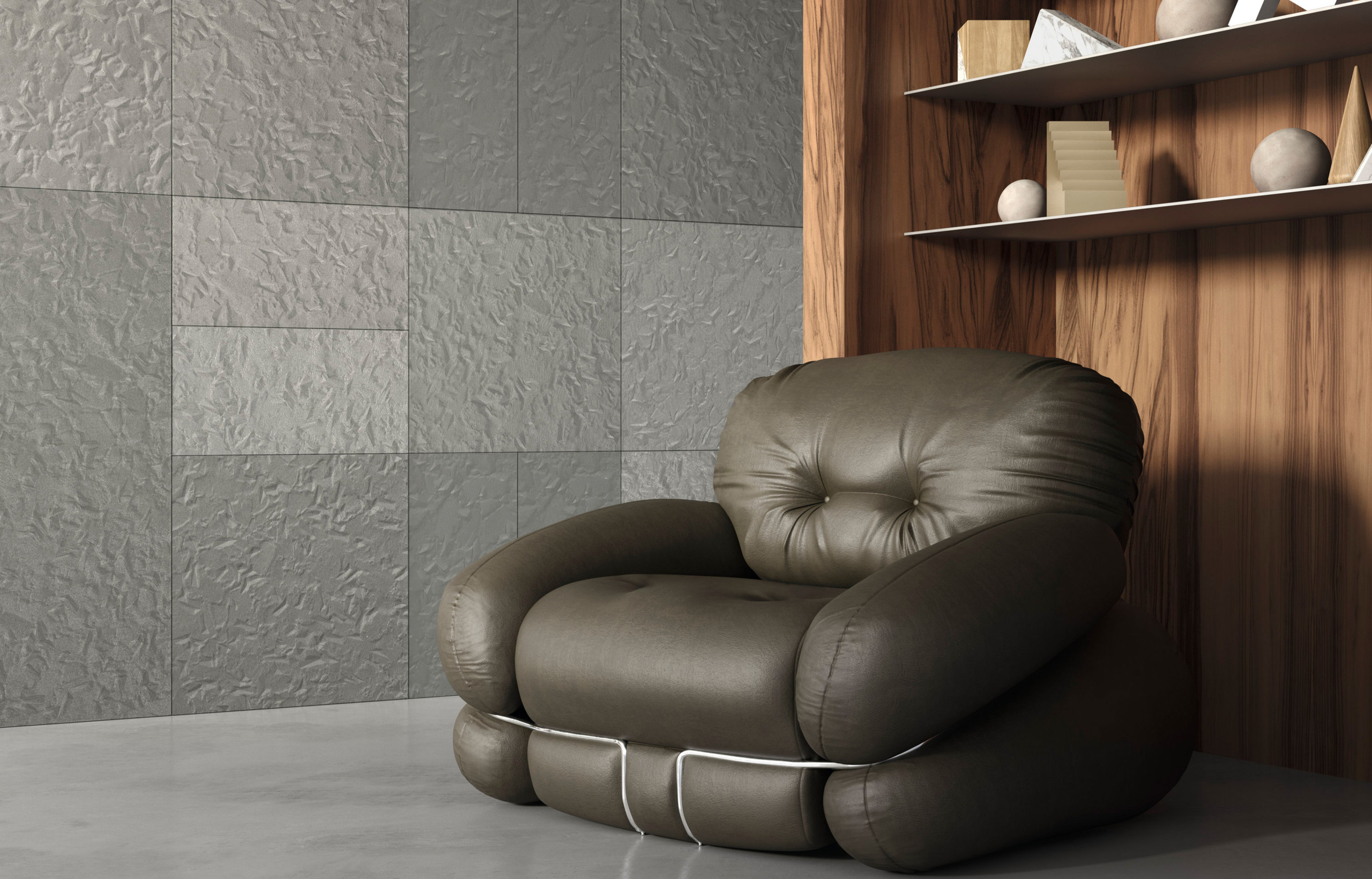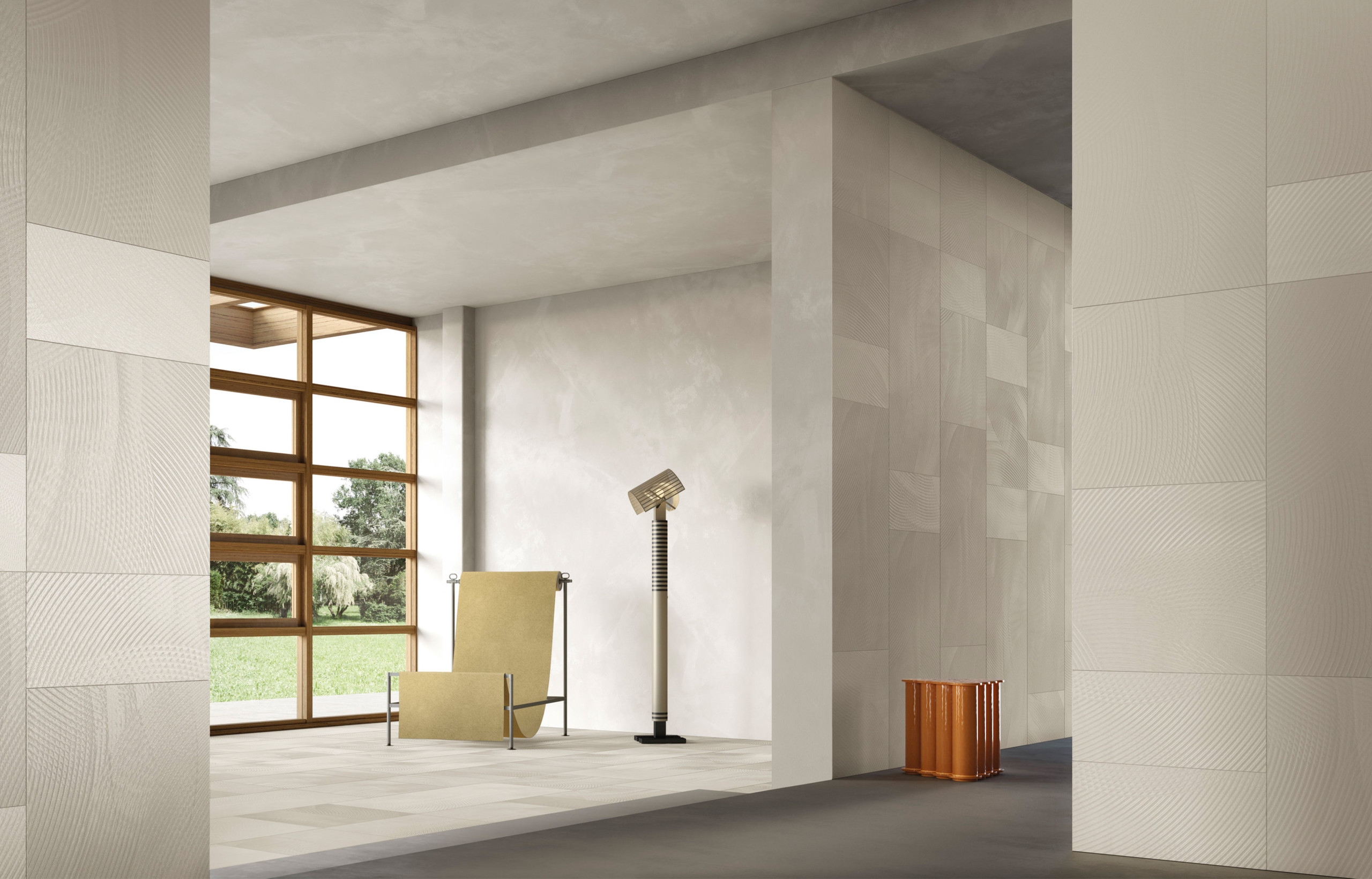 Traversée de motifs tridimensionnels évoquant des peintures, la collection reprend les mouvements sinueux caractéristiques de Serie 100 en les déclinant selon trois design (contre un auparavant). De Fold et ses formes irrégulières rappelant du papier ondulé à Paint et son effet spatulé ou Net qui imite un tissage métallique, ces textures semblent s’animer sous l’effet de la lumière. Car -tout comme la gamme dont elle s’inspire- Tribute100 se distingue elle-aussi par une exceptionnelle brillance soulignant ses aspérités. Mais grâce à un nouveau process de production introduisant des émaux micacés en céramique, la luminosité est à présent diffusée dans toute sa surface. Proposée dans trois formats (120×60, 60×60 et 60x30cm), la collection se décline en outre dans une palette de quatre nuances : la radieuse et irisée Pearl, le gris Shark à la consistance changeante, la douce et terreuse Mink ou la neutre et profonde Titanium. Permettant de créer de singuliers effets esthétiques en mélangeant formats, couleurs et designs, Tribute100 réinterprète et élargit le spectre décoratif d’une collection pivot dans l’histoire de Fiandre. Comme un trait d’union entre mémoire et futur.