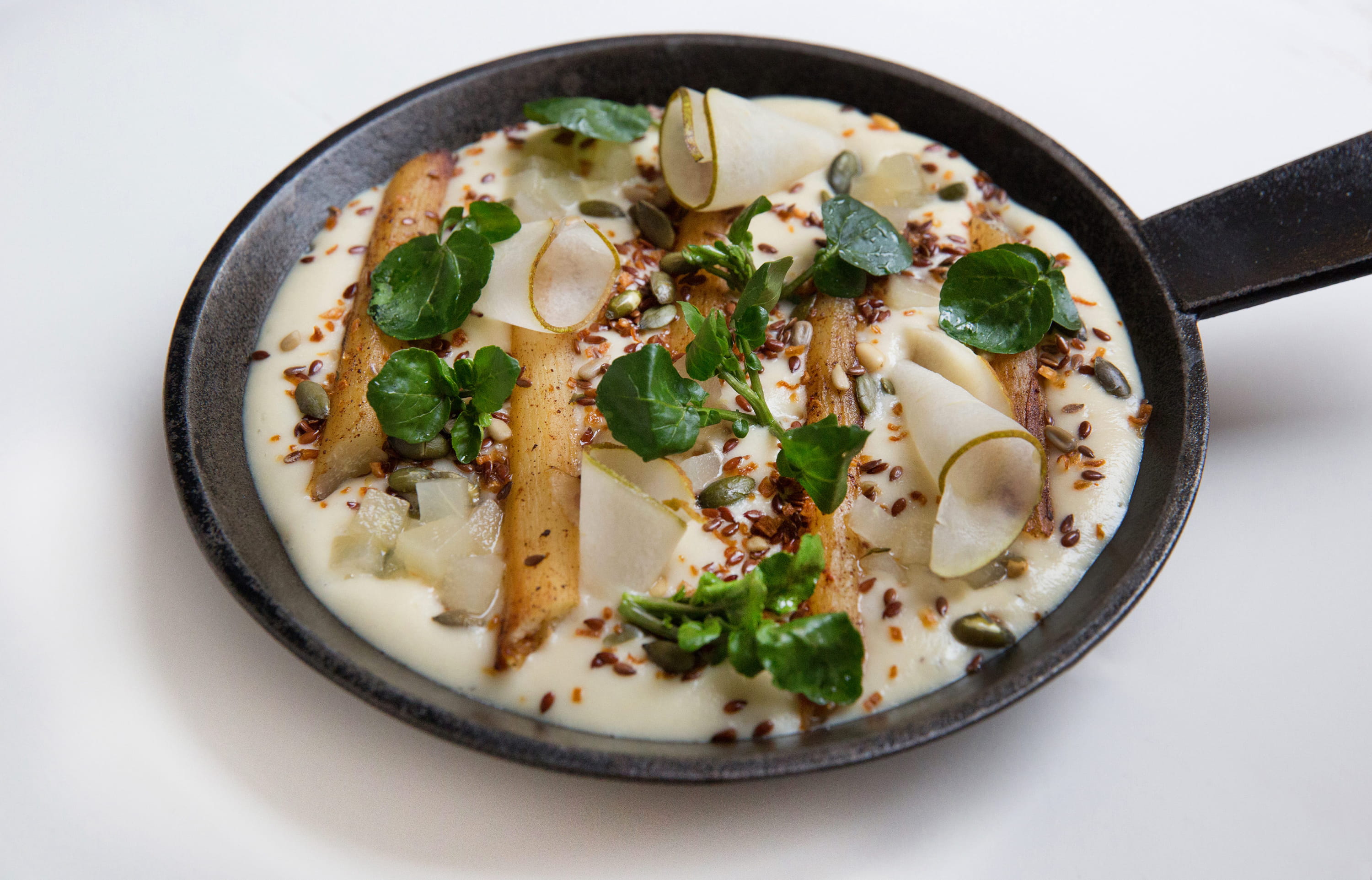 GrandCœur (@grandcoeur.paris) s’ouvre ainsi en mode brasserie et les lauriers suivent : assiettes plongées dans le bleu de la Méditerranée sur fond de mythique Café de la Gare et d’été en pente douce chauffé par une terrasse parfaite. « Dès le départ, l’arrière-pensée en germe était de mettre les légumes au centre de la table », explique Julien Fouin. Dont acte, dernièrement, à la faveur d’une nouvelle pièce de 25 couverts, Le Jardin, confiée à la jeune architecte Brune de La Guerrande, « remarquée pour son joli travail au Coretta ». Fauteuils Thonet, tables rondes lovées en étoile, clair-obscur de forêt primaire et plantes en cascade ordonnent cette jungle intimiste.