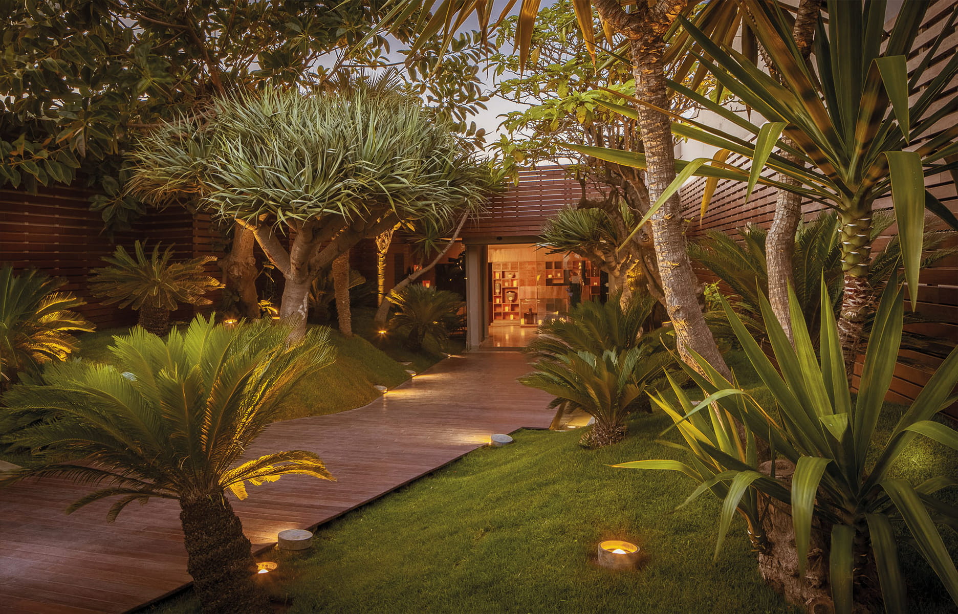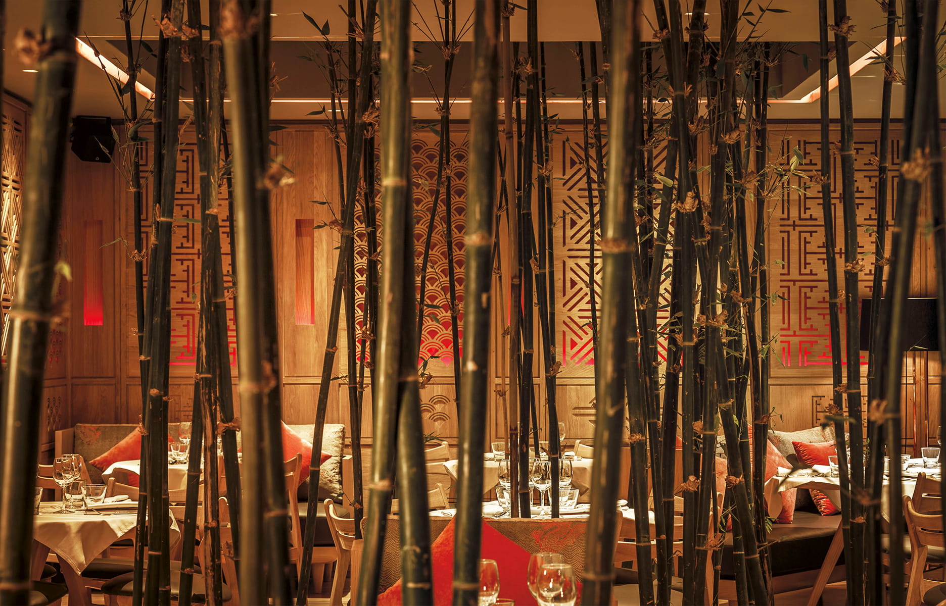 Le duo a signé une décoration raffinée et scénographique, qui se dévoile progressivement. Avant d’accéder au restaurant, patience : un chemin serpente entre la végétation luxuriante de la cour et guide les visiteurs vers l’intérieur. Les architectes se sont souvenus de la structure en terrasses des rizières chinoises pour agencer un espace déployé sur trois niveaux descendant progressivement vers la mer. Partout domine l’alliance subtilement dosée entre la nature et le construit, jusqu’aux bambous élancés qui poussent dans l’une des salles du Lily’s !