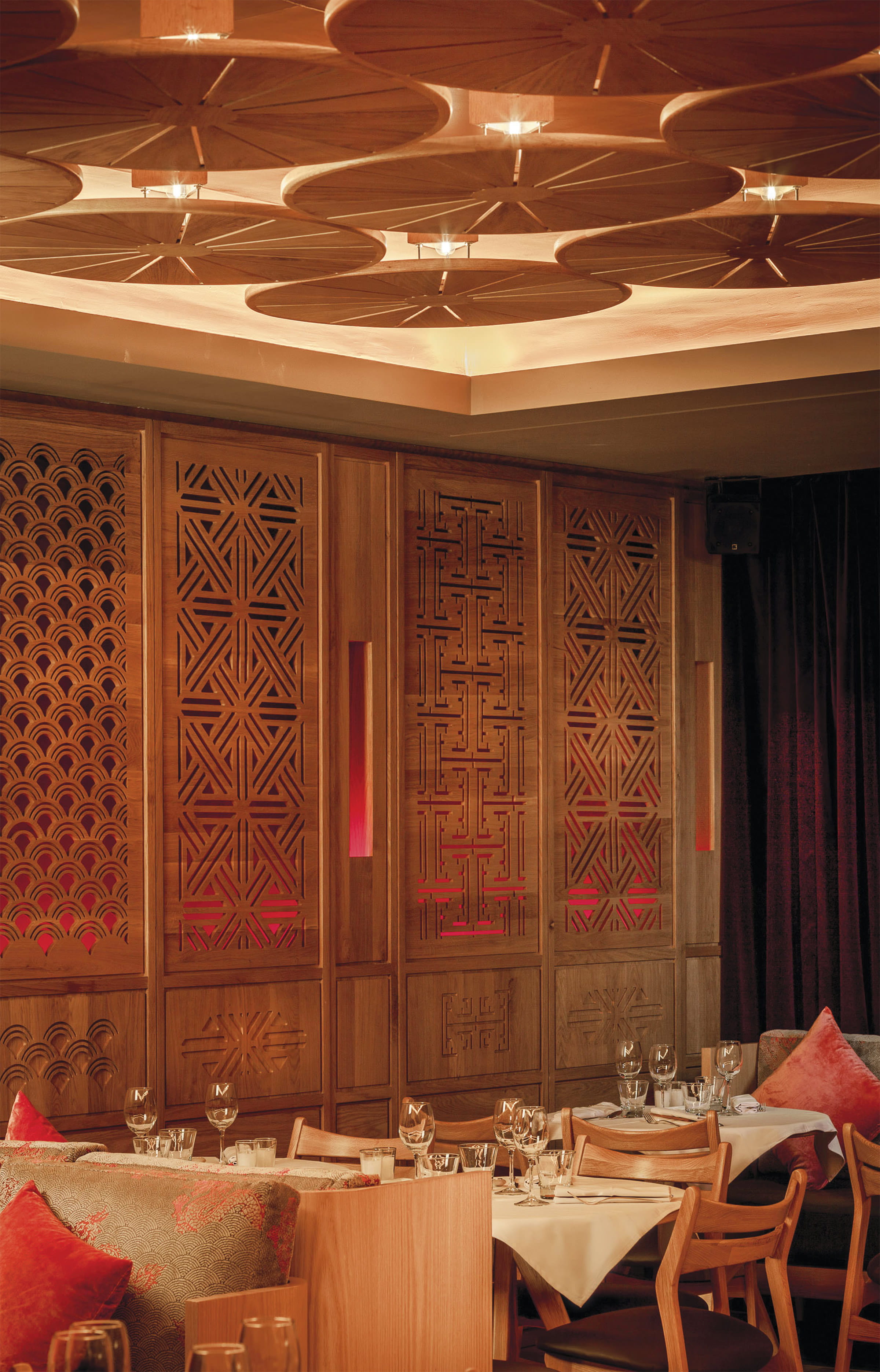 La décoration des salles a été orchestrée avec un sens rare du détail. Sans superposition répétitive des ambiances, les trois espaces – la salle des ombrelles, la salle des bambous et la salle des papillons – se succèdent en se complétant. Elles tirent leurs noms des motifs choisis – papillons ou ombrelles stylisées au plafond, et véritables bambous. Pensées comme des ponts entre la terre et la mer, ces salles aux grandes baies vitrées bénéficient d’une large vision sur l’extérieur tout en offrant une atmosphère intimiste. Côté cuisine, il n’y a que l’embarras du choix entre les plats coréens ou vietnamiens, chinois ou japonais… Dans ce décor idéal, ils se dégusteront encore mieux !
