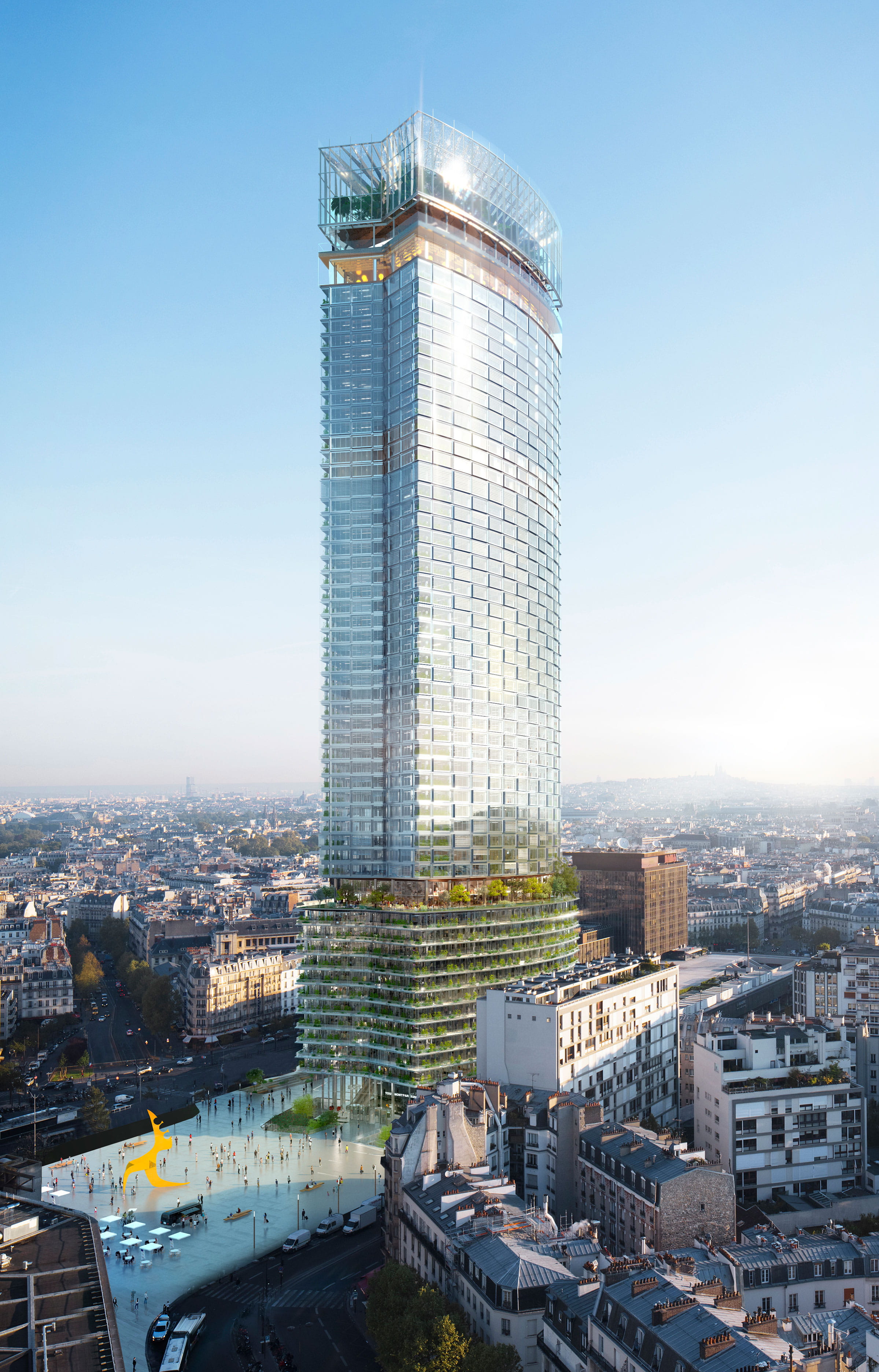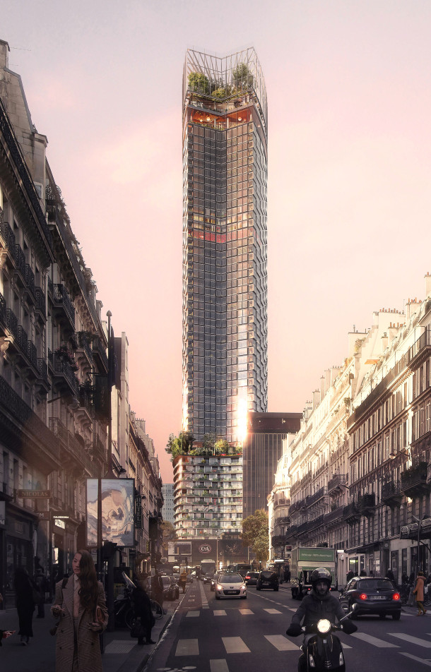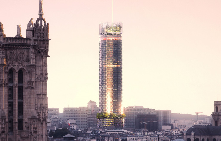 « Notre ambition était de révéler la beauté de la tour Montparnasse en partant de l’intérieur, par le prisme d’usages nouveaux et par une métamorphose bioclimatique de la façade. Nous avons souhaité en faire l’icône de la révolution énergétique du XXIe siècle. » Loin de se limiter à un simple rhabillage, le projet lauréat est assurément celui qui respecte le mieux le bâtiment originel. Un choix assumé par les architectes. Trop sage, jugent ses détracteurs. Pertinent et tourné vers l’usage, a tranché le jury. La tour est épaissie en partie inférieure, coiffée d’une serre de 18 mètres de hauteur et agrémentée, au 14e étage, de jardins suspendus. Le bâtiment jusqu’à présent réservé aux bureaux laisse place à la vie, 24 heures sur 24. Au verre fumé, qui a forgé sa mauvaise réputation, se substitue une façade transparente. Quant à sa consommation énergétique, avec une autonomie pendant 70 % de son temps d’usage, elle promet d’être divisée par dix.